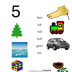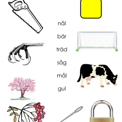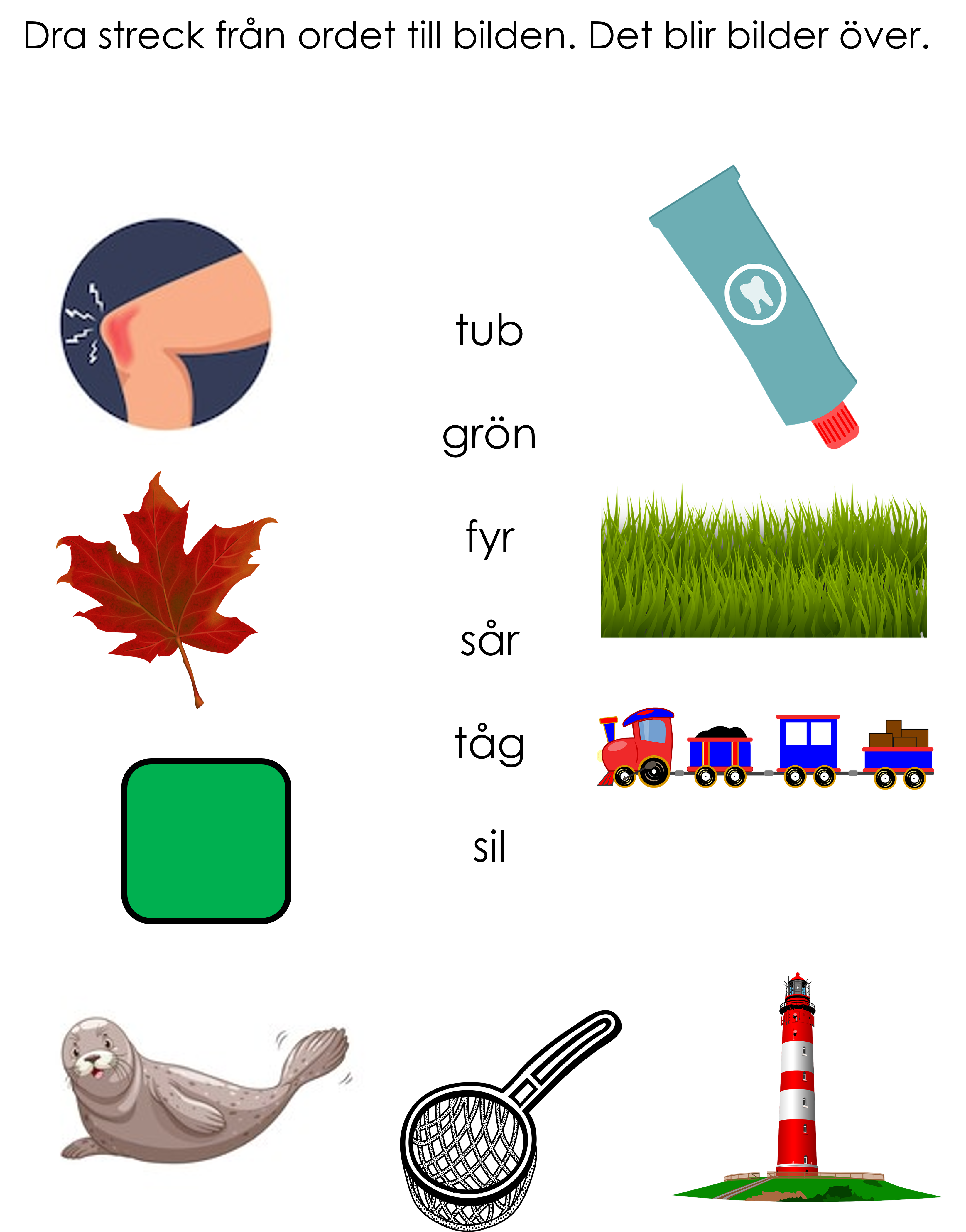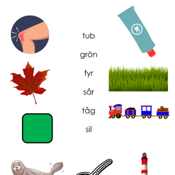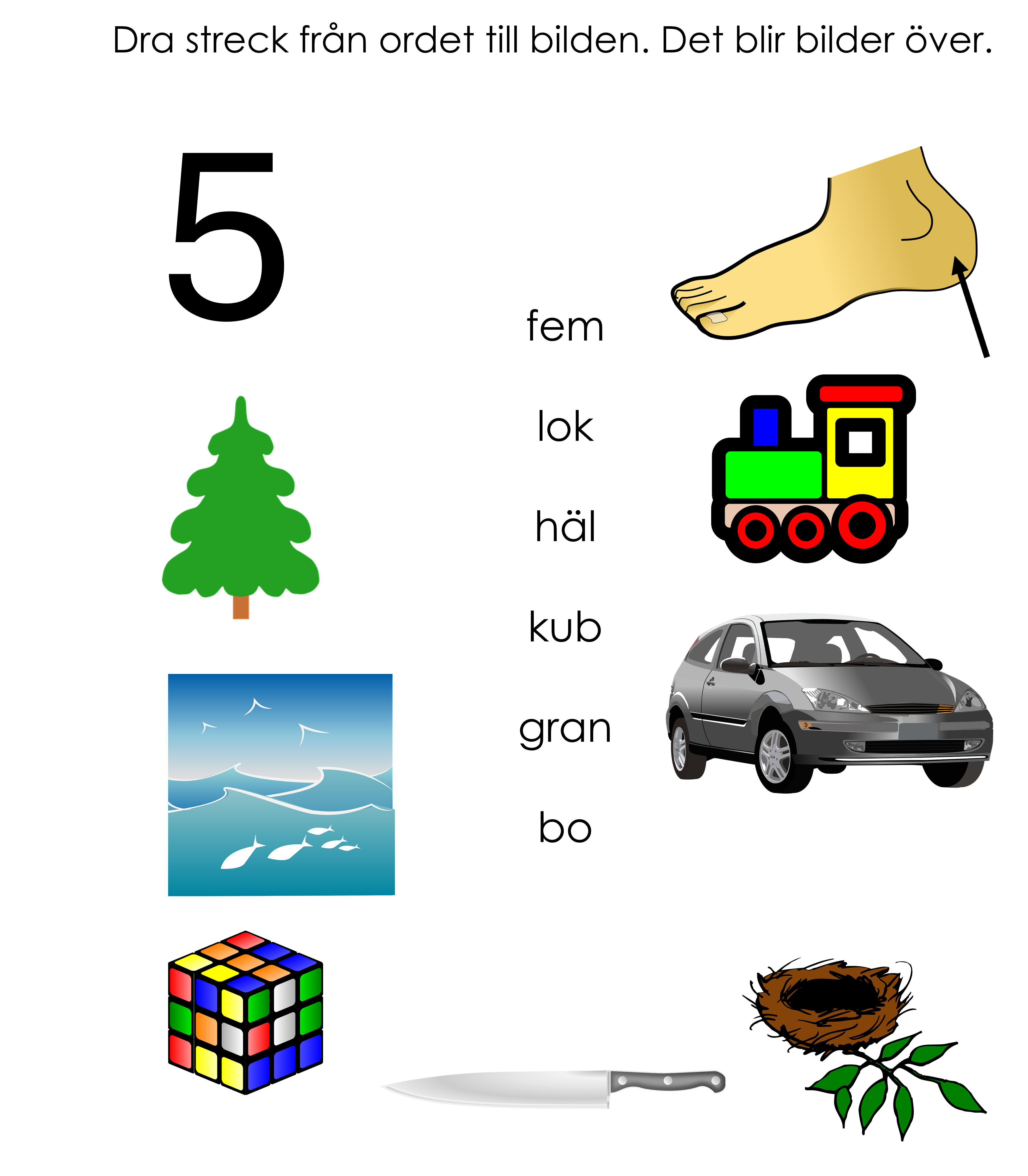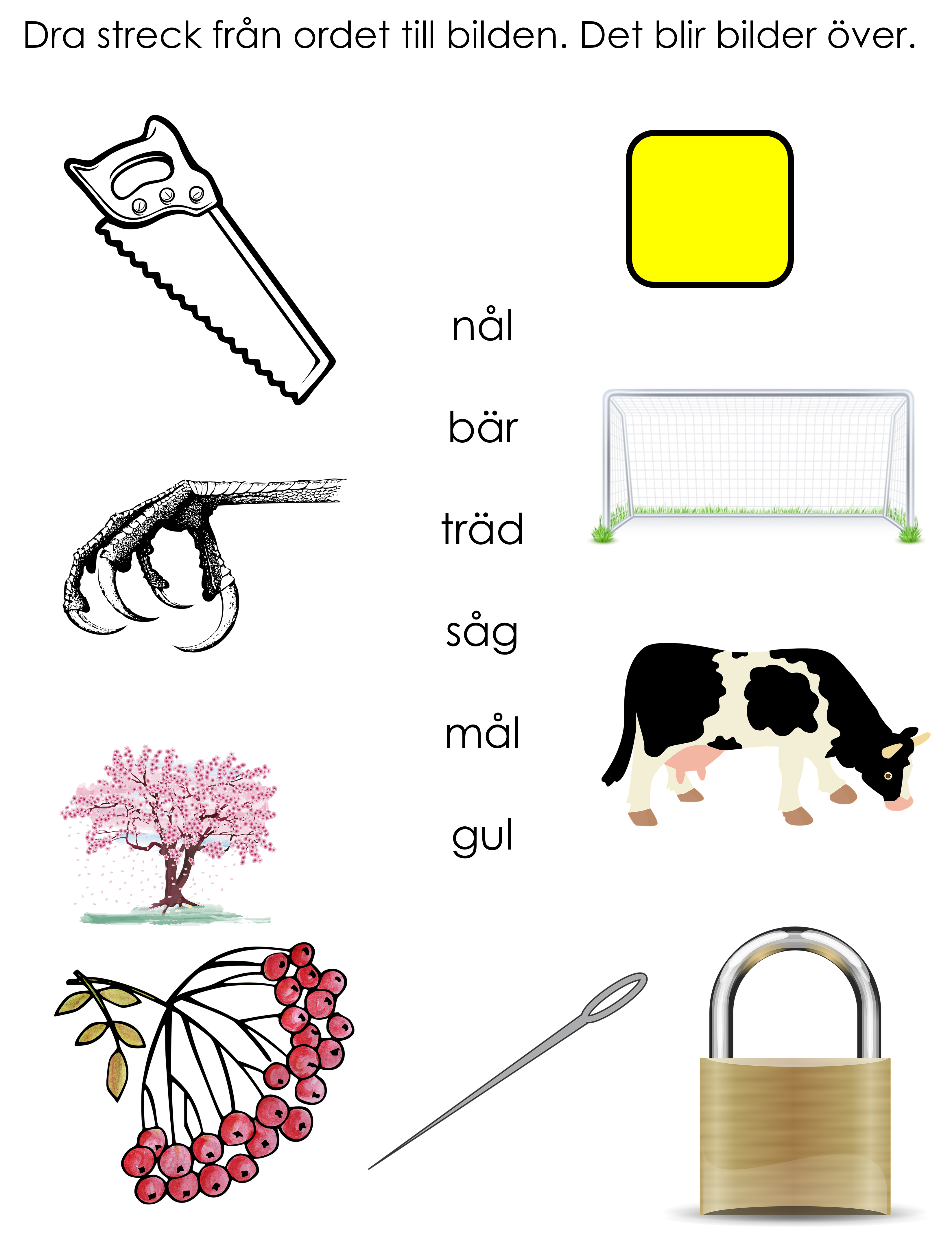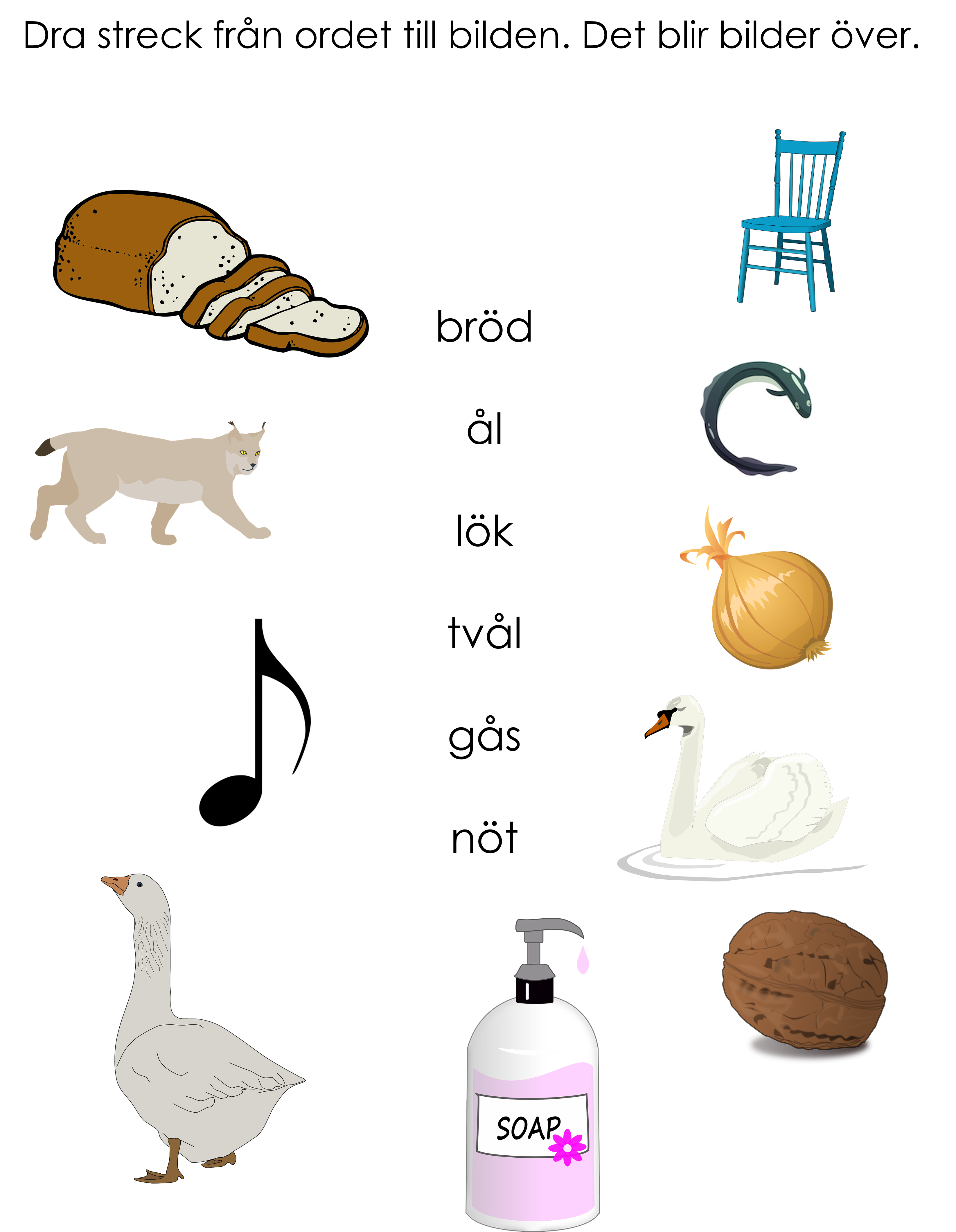 Materialet är ett läsmaterial. Det är ord från det ”rosa ord”, vilket är ljudenliga ord. Barnet läser orden och drar streck till rätt bild. Det finns ca 3 bilder utan ord.