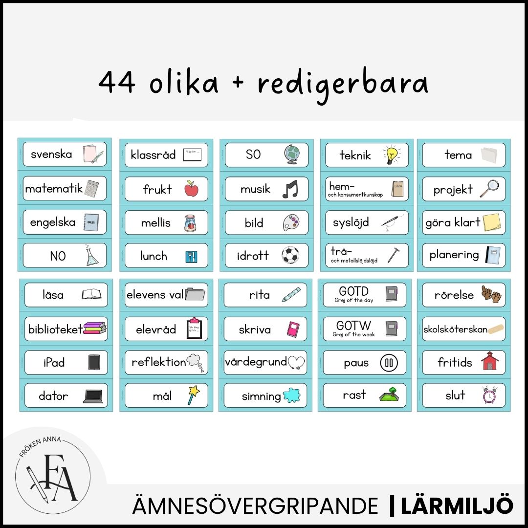 44 stilrena schemaskyltar i blått. Det medföljer även tomma mallar om du vill lägga till egna skyltar (redigerbara i Powerpoint) Dessa matchar perfekt till det övriga rainbowtemat, men kan också användas separat.