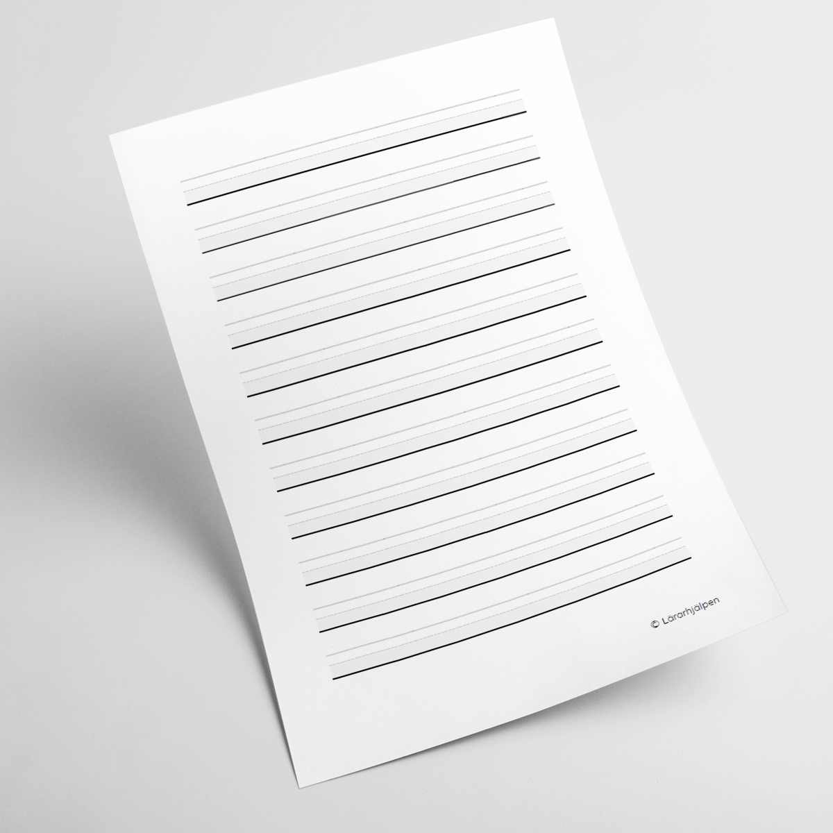 Stödlinjer som hjälper elever att skriva. Den svarta linjen markerar skrivlinjen. Kan användas i alla ämnen vid all sorters textskrivning. Ha gärna papper med stödlinjer tillgängligt i klassrummet hela tiden för en differentierad undervisning.