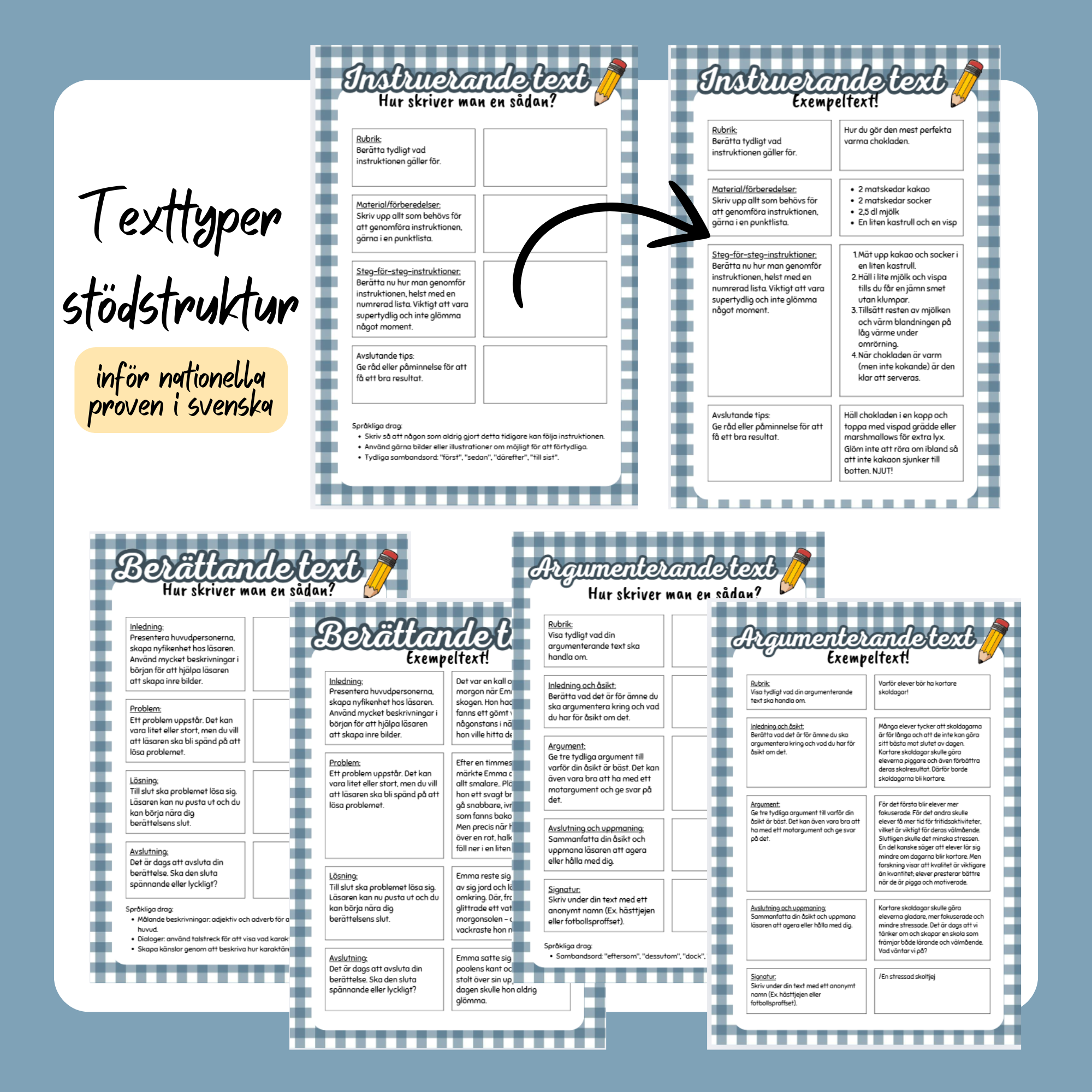 Tre olika stödstrukturer för texttyperna berättande text, argumenterande text och instruerande text. Till varje struktur finns även exempel på text, så att eleverna kan få se exempel på en godkänd text kan se ut. Stödstrukturerna är toppen att använda inför nationella proven i svenska, eller bara generellt vid undervisning kring de olika texttyperna.