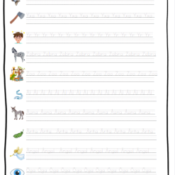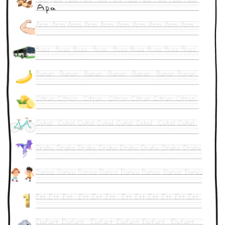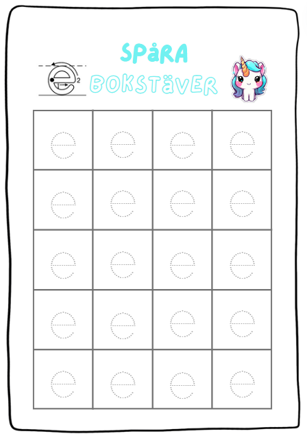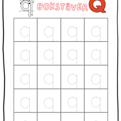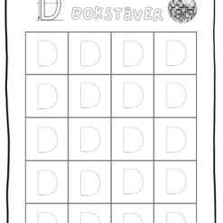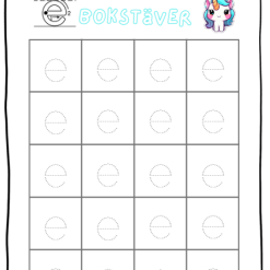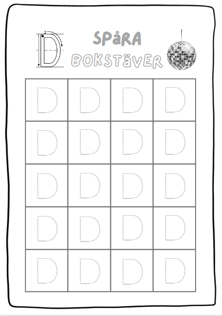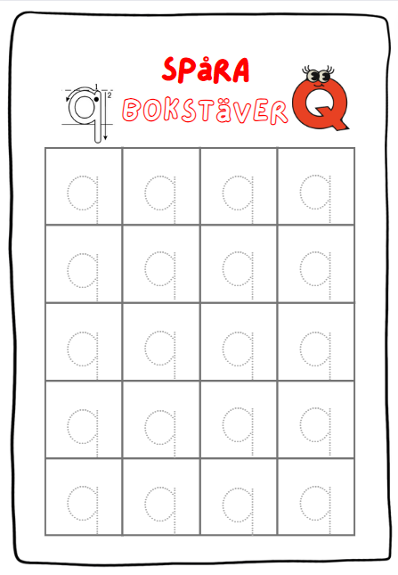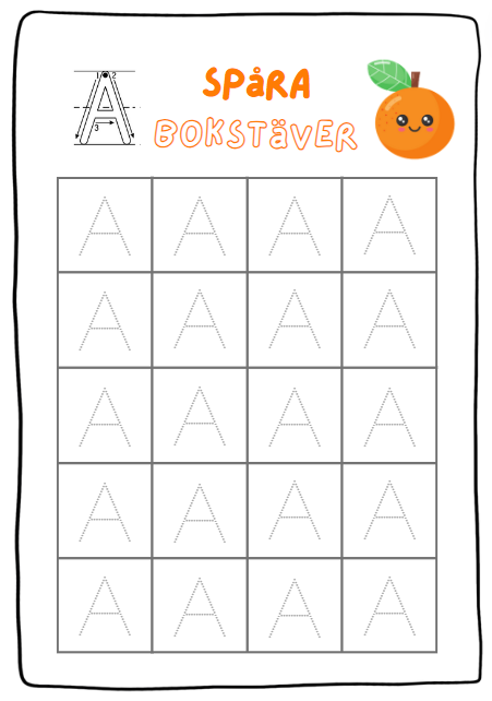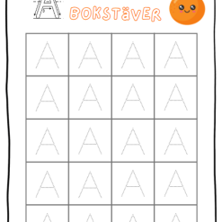 - 2 sidor till varje bokstav där eleven ska spåra bokstäverna. (1 sida för gemen och 1 för versal)