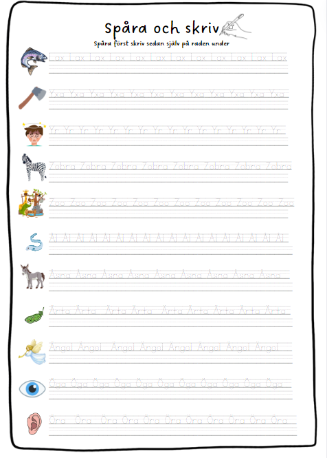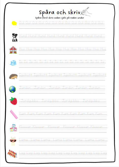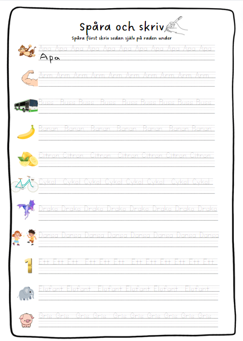 - 5 sidor där eleverna först spårar ord och sedan skriver själv under