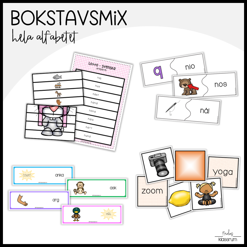 I materialet ingår spel för hela alfabetet i form av domino, lotto, memory och pussel.