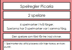 Ett strategispel som ursprungligen kommer från Amerikas indianer. Spelet tränar taktik och går ut på att man ska få tre i rad. För två spelare.