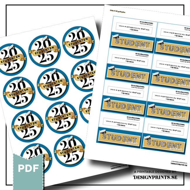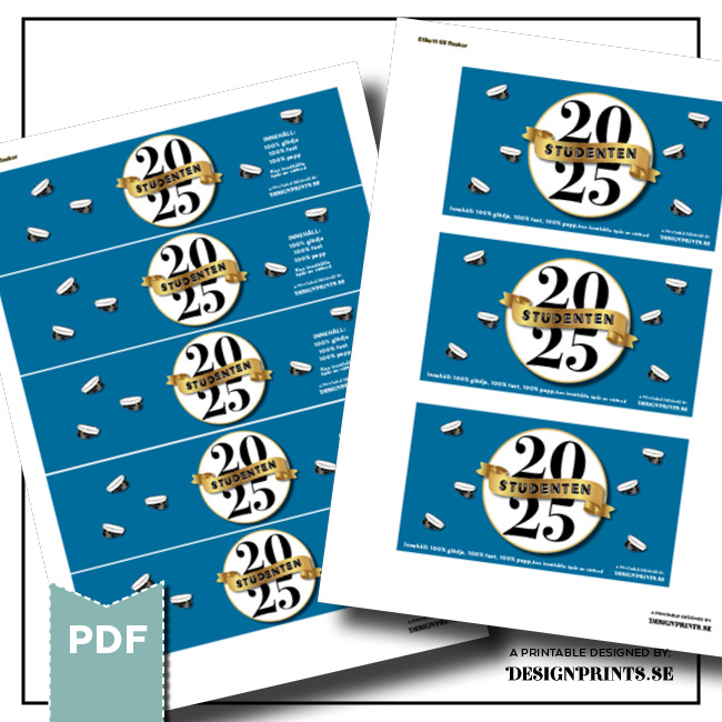 Bonus! Du får med de populära etiketterna att fästa på små eller stora vattenflaskor. Perfekt som ”medalj” till studenterna.