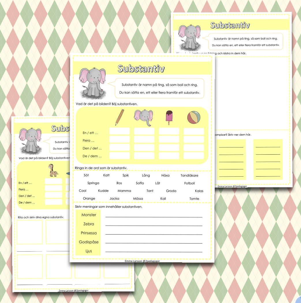 - 2 arbetsblad med blandade övningar där eleverna får öva på substantiv genom att bland annat urskilja substantiv, böja substantiv, skriva meningar till substantiv och hitta på egna substantiv.