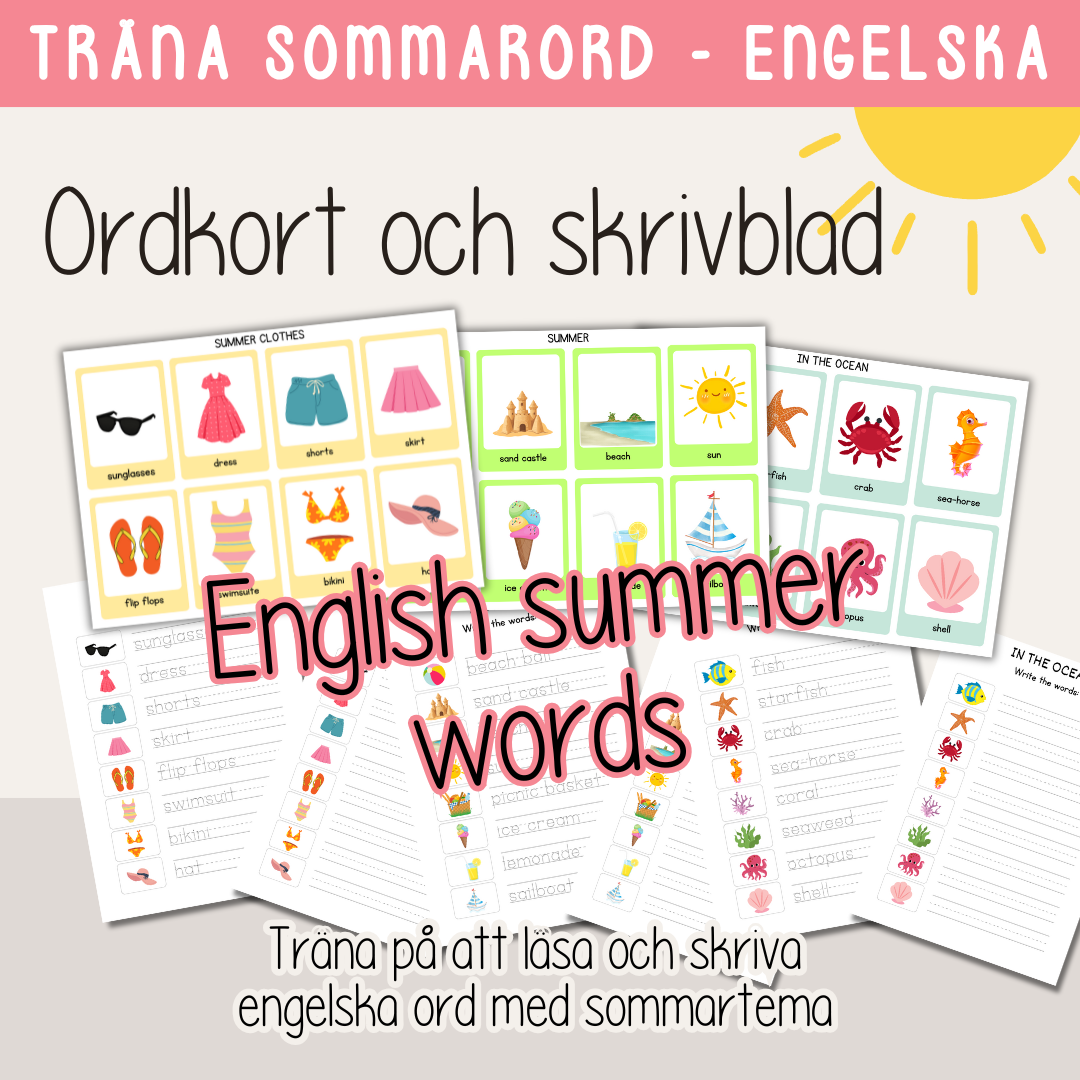 Materielet innehåller 24 flashcards med sommarord på engelska samt skrivblad med och utan hjälpord.