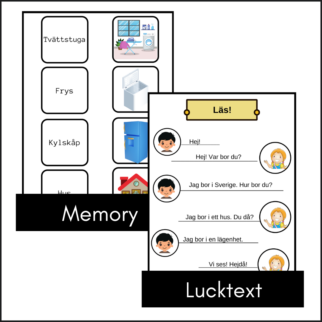 Paket med 6 övningar för att träna grundläggande svenska. I detta paket arbetar vi med hemmet på ett väldigt enkelt sätt.