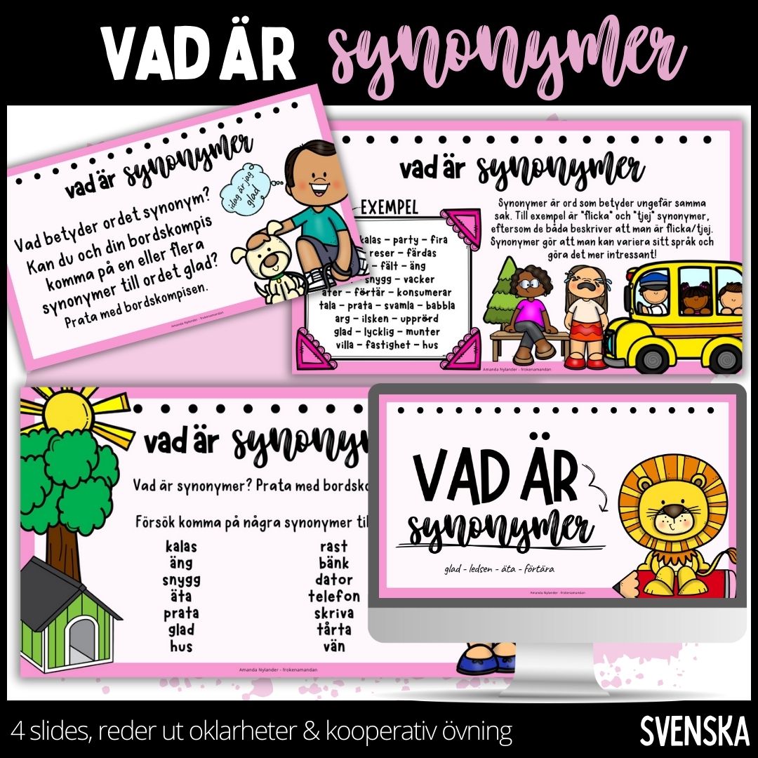 Öva på synonymer med hjälp av denna presentation. Presentationen består av 4 slides som ger dig möjligheten att arbeta kooperativt och språkutvecklande med dina elever. När jag gjort presentationen har jag utgått från Klara svenskan åk 4.