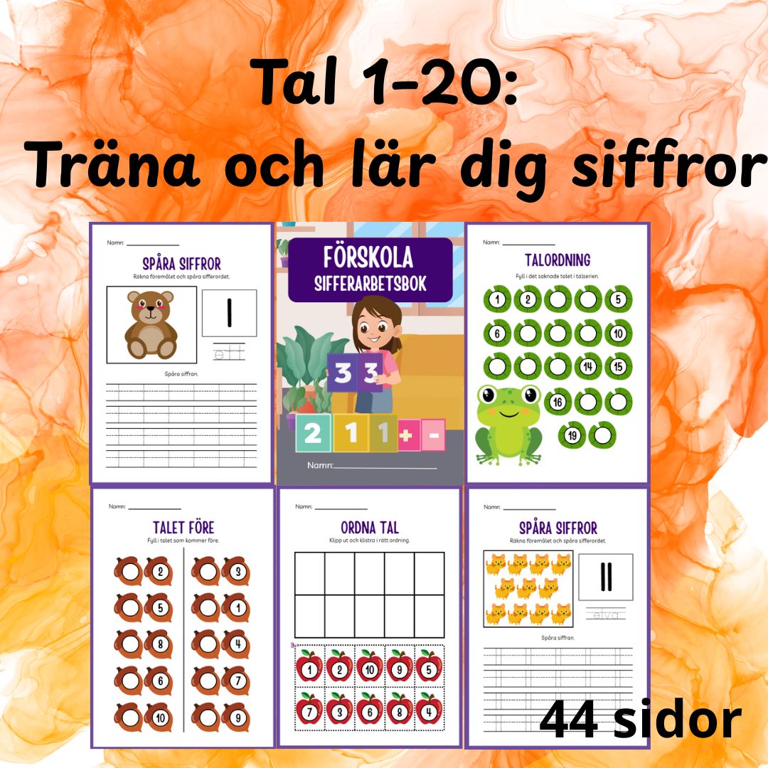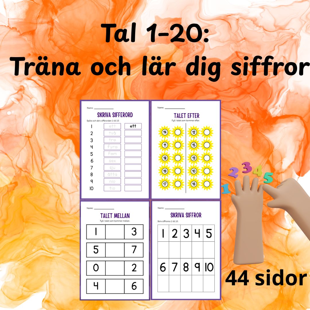 Detta omfattande arbetsmaterial på 44 sidor hjälper barn att lära sig och befästa talen 1–20 genom varierade och lekfulla övningar. Barnen får träna på att räkna, spåra siffror, skriva sifferord, ordna tal i rätt följd och hitta talet före, efter och mellan. Materialet stärker både finmotorik, talförståelse och tidig matematisk förmåga på ett roligt och pedagogiskt sätt.
