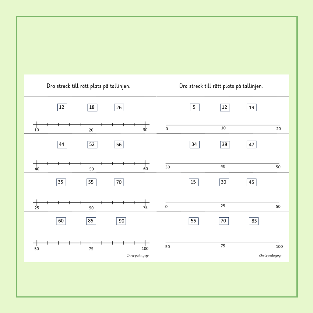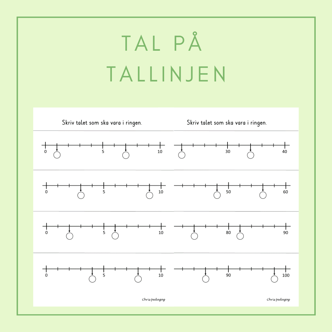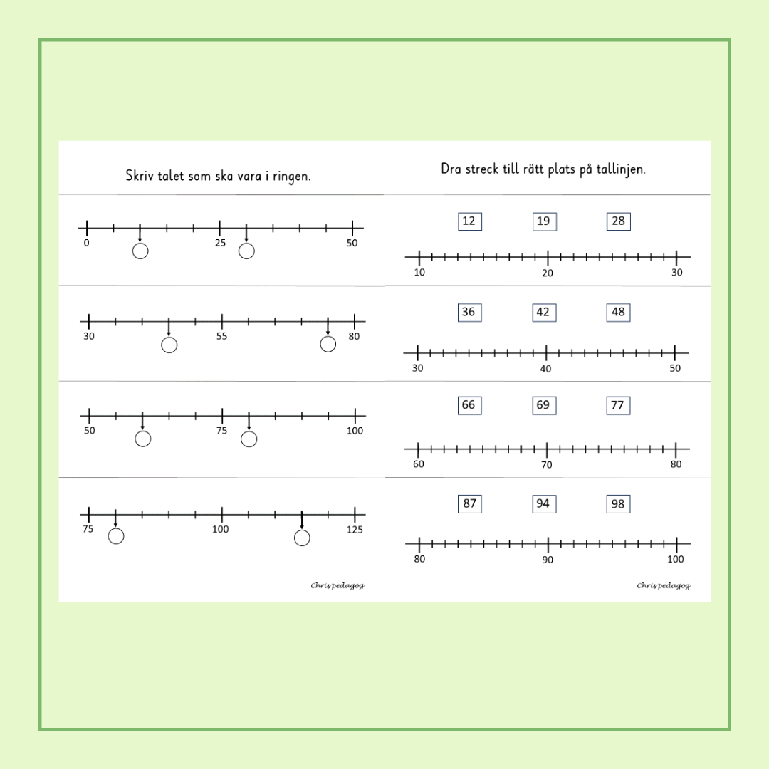 8 st arbetsblad om tal på tallinjen i varierande svårighetsgrad. Från tallinjen 1-10 till tallinjer utan markeringar för talen.