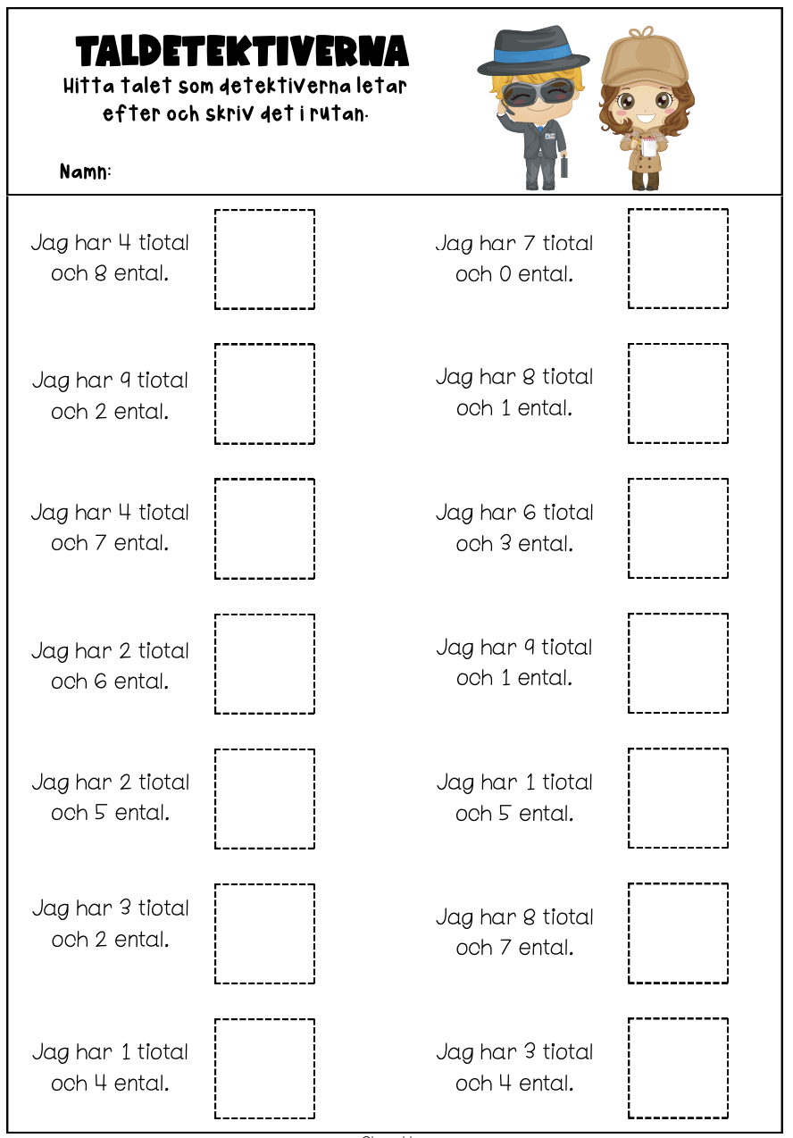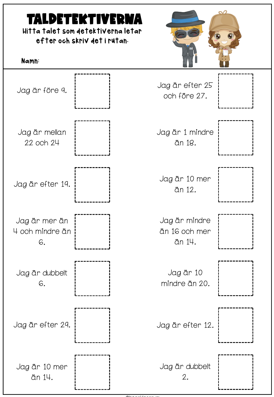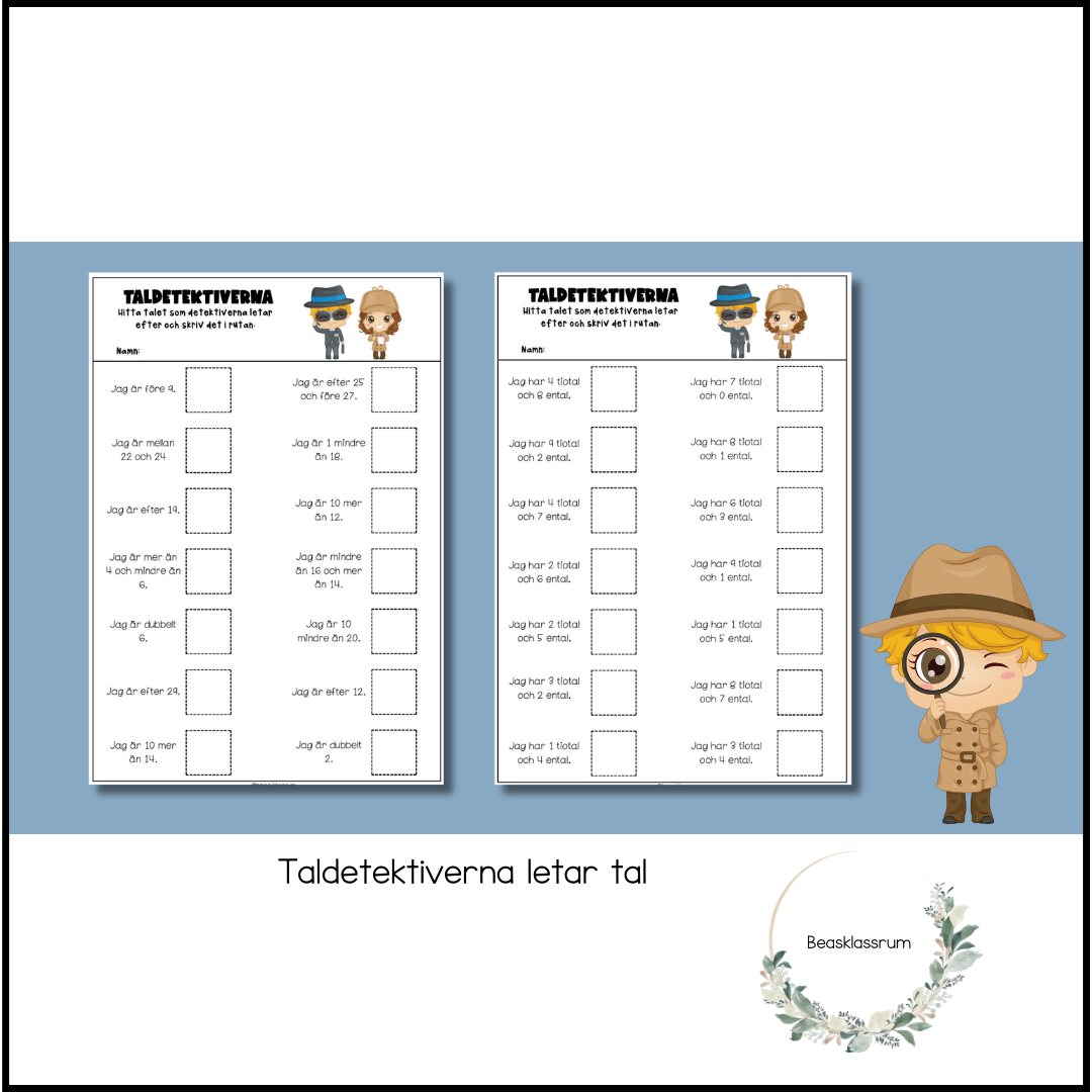 5 arbetsblad i olika svårighetsgrad där taldetektiverna letar tal.