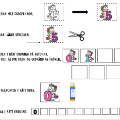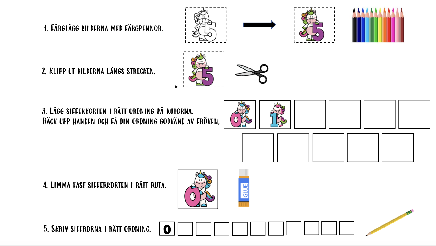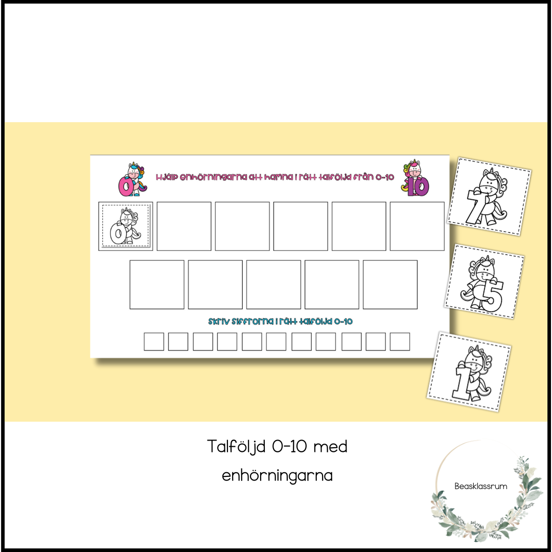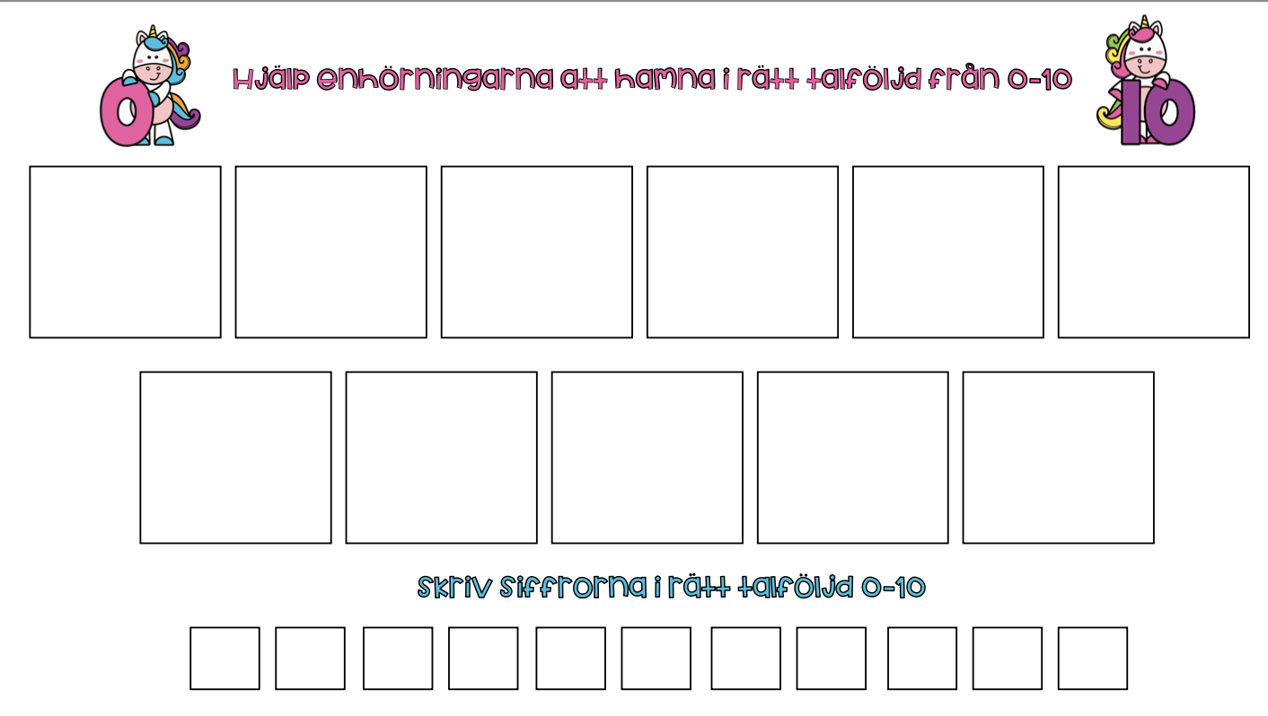 Material där eleverna tränar talföljden 0-10 genom att placera enhörningar i rätt ruta.