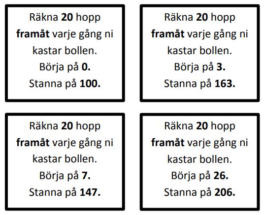 I par drar eleverna ett kort. På kortet står ett starttal och ett sluttal. Eleverna kastar en boll/ärtpåse mellan sig. De ökar/minskar talet med 10 eller 20 för varje kast.