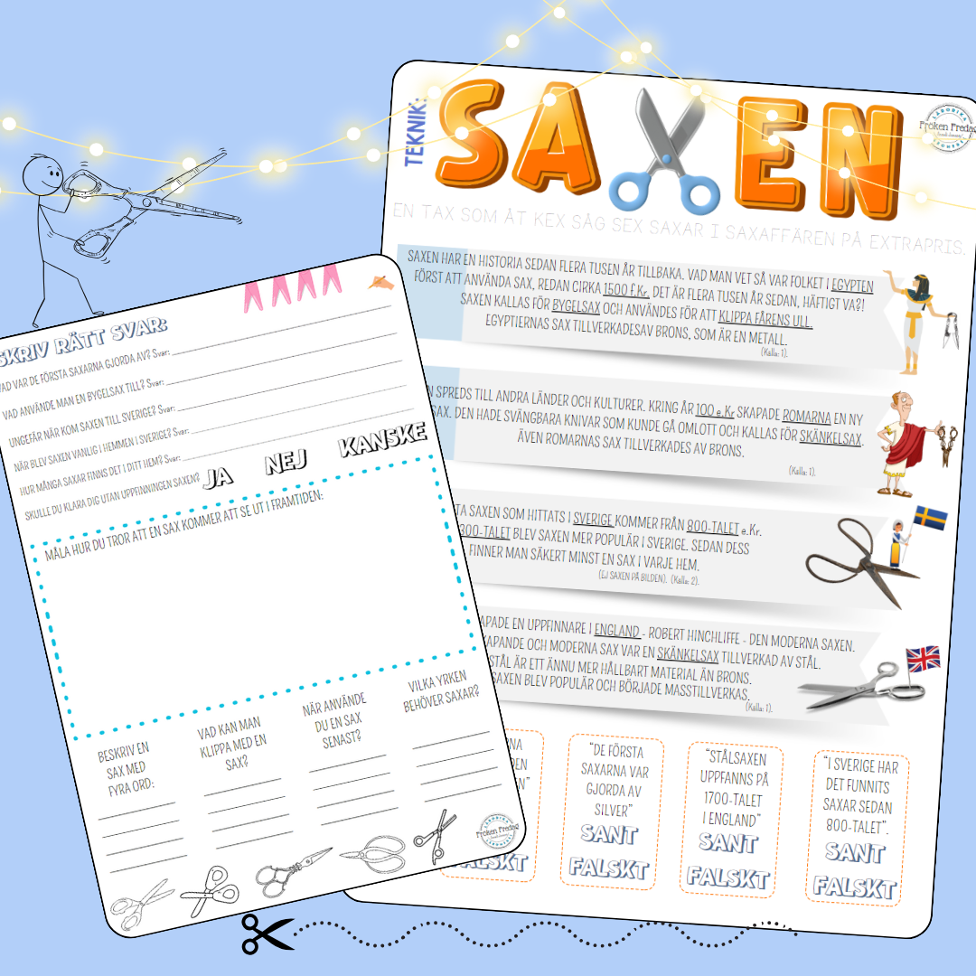 Fakta och historia om saxen – visa din förståelse med sant/falskt, skriv rätt svar, läsförståelse, färglägg rätt svar, måla framtidens sax, designa din egen sax, klipp längst linjerna med mera.
