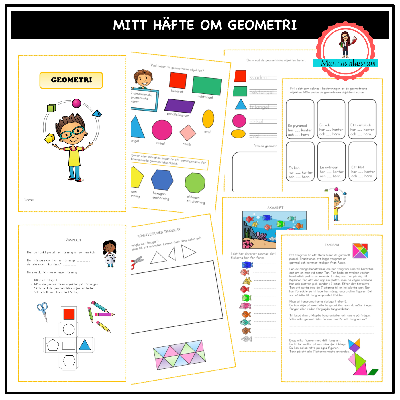 Häftet innehåller många olika övningar som tränar de geometriska objekten både 2D och 3D. Eleverna får skriva, rita, måla, skapa och undersöka på 29 arbetssidor. Det ingår även 10 olika bilagor där de får klippa ut geometriska objekt som de behöver till övningarna där de skapar och undersöker.