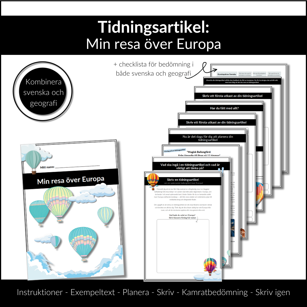 I mina klasser just nu skriver de tidningsartiklar på svenskan och arbetar med Europa på SO. Så här kommer ett arbete där du kan kombinera dessa två. Ett arbetsområde där eleverna ska få planera och skriva en tidningsartikel där de låtsas att de har flugit med en luftballong mellan två platser i Europa. Eleven får själv välja mellan vilka platser men behöver beskriva utförligt vad hen ser på vägen. Här får man bland annat in namngeografi, begrepp, natur och klimat.