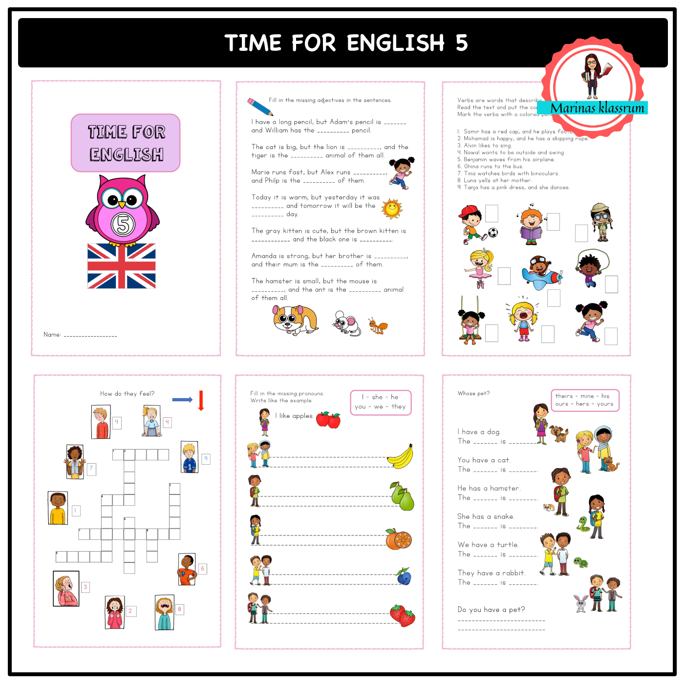 Ett arbetshäfte som tränar engelska för de som har kommit lite längre med språket. Eleverna får läsa, skriva och måla kring: feelings, pets and fruits. De får också träna enkel grammatik med prepositioner, pronomen , verb i olika tidsform och komparera adjektiv samt klockan heltimmar, halvtimmar, kvart i och kvart över.