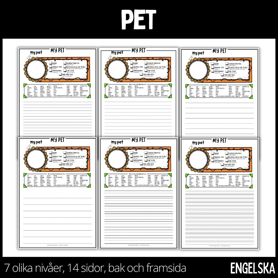 Låt eleverna öva på att skriva på engelska med hjälp av dessa arbetsblad. I materialpaketet ingår sju skrivmallar med en och samma illustration. Totalt innehåller paketet 14 sidor. Tre av skrivmallarna innehåller välskrivningsrader medan fyra av dem innehåller ”vanliga” linjära rader. Varje mall innehåller även en stödstruktur i form av en checklista samt ordlista som eleven kan ta hjälp av i skrivprocessen.