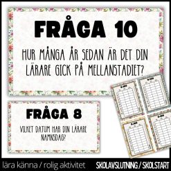 Låt eleverna lära känna dig på ett roligt sätt med hjälp av denna presentation inspirerad av spelet 0-100. Låt eleverna gissa på en siffra mellan 0-100 på presentationens 10 olika påståenden. Spelet handlar om att få så få poäng som möjligt. För rätt svar får eleven -10 poäng, och för varje fel svar får eleven så många poäng som gissningen diffa från det rätta svaret. Använd materialet som ett roligt avslut på terminen och/eller som en rolig uppstart vid den nya terminen, eller när som helst under terminens gång.
