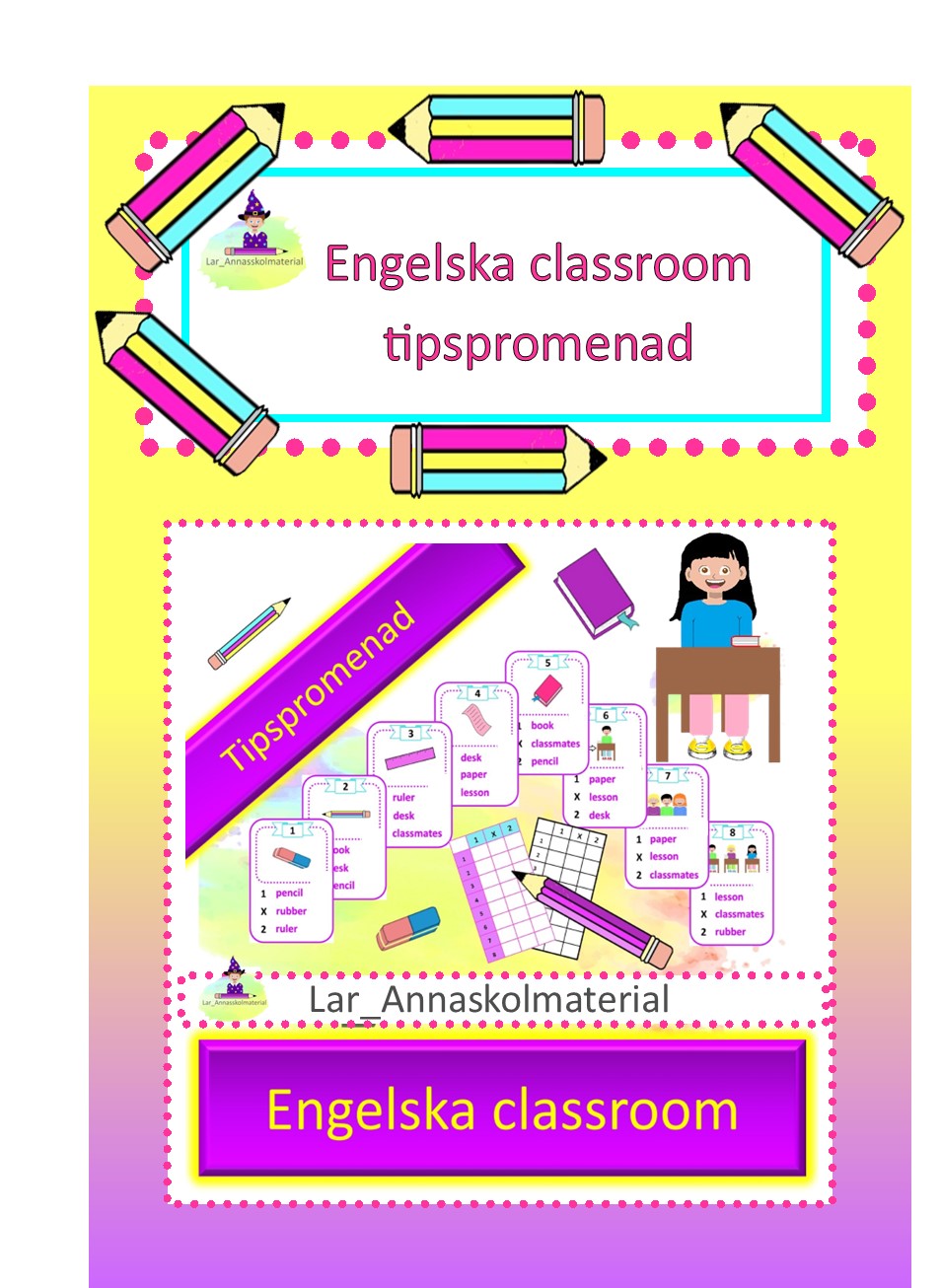Tipspromenad med 8 st engelska klassrumsord. Innehåller 2 olika svarsbrickor. En i färg och en svartvit.