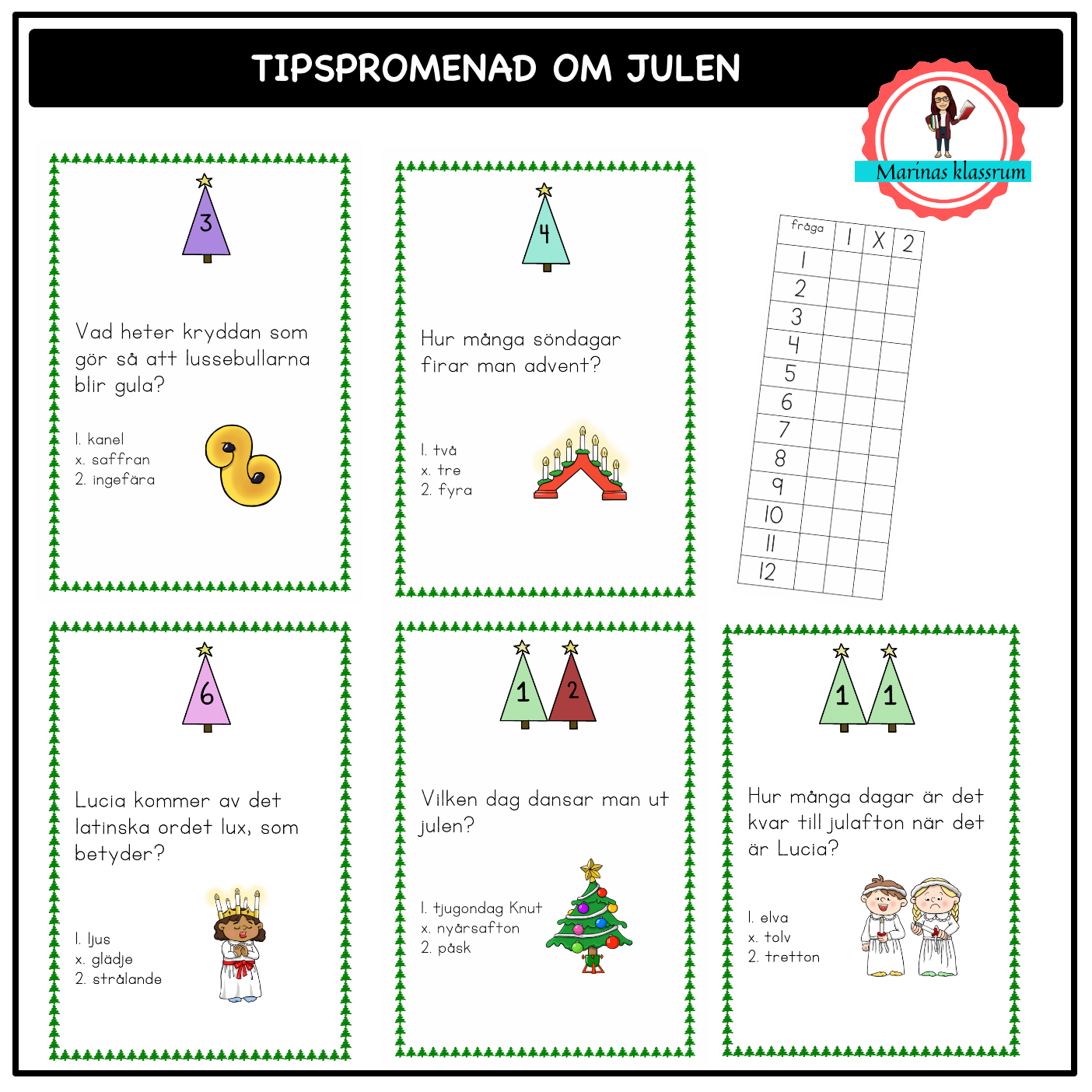 En tipspromenad med 12 frågor om julen. Svarstalong och facit ingår.