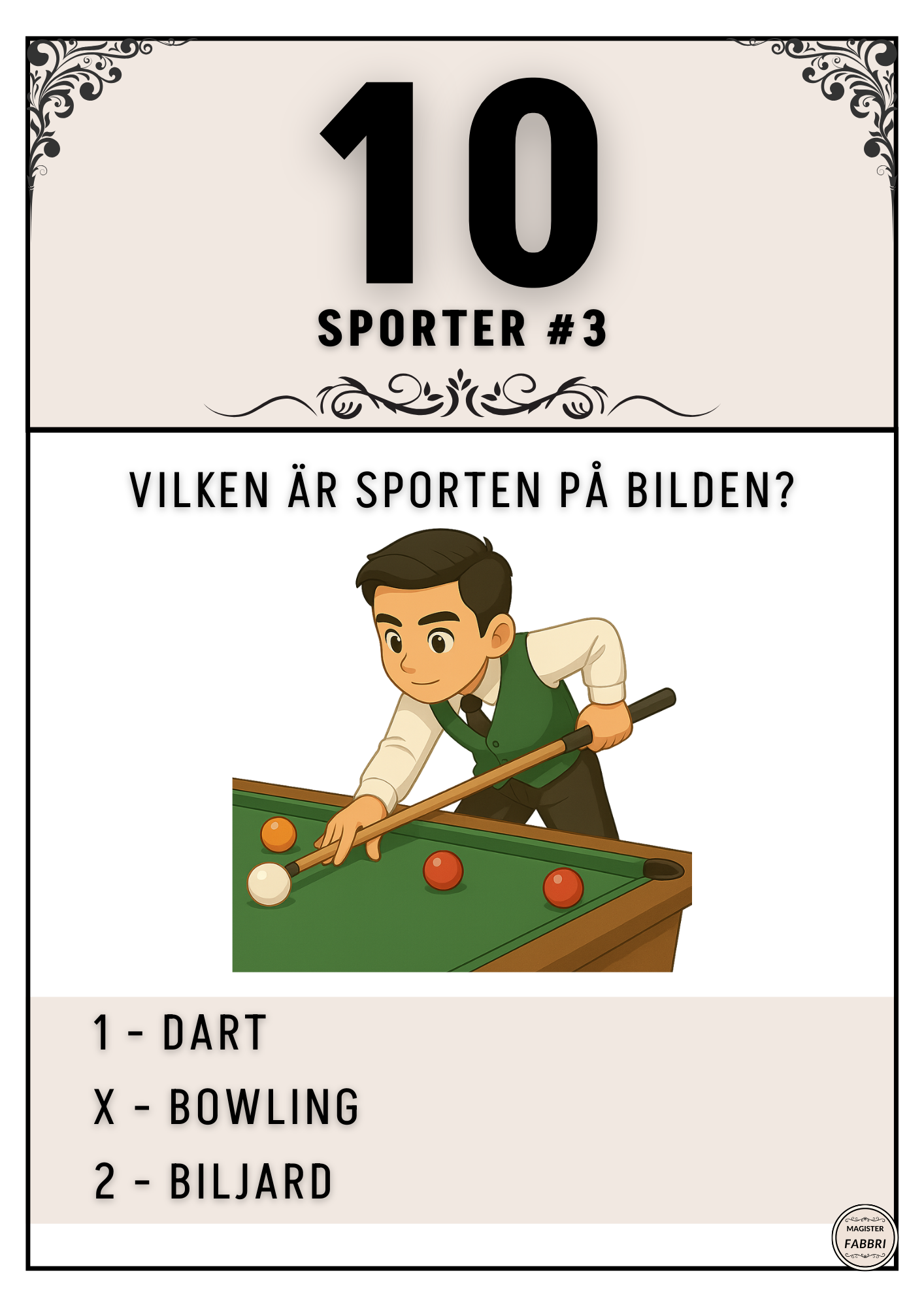 Här kommer en samling med 5 tipspromenader med 10 frågor på varje med temat sport. Samtliga frågor är 1, x, 2-frågor med en bild. Frågorna utgår från att man ska se vilken sport som hör ihop med bilden.