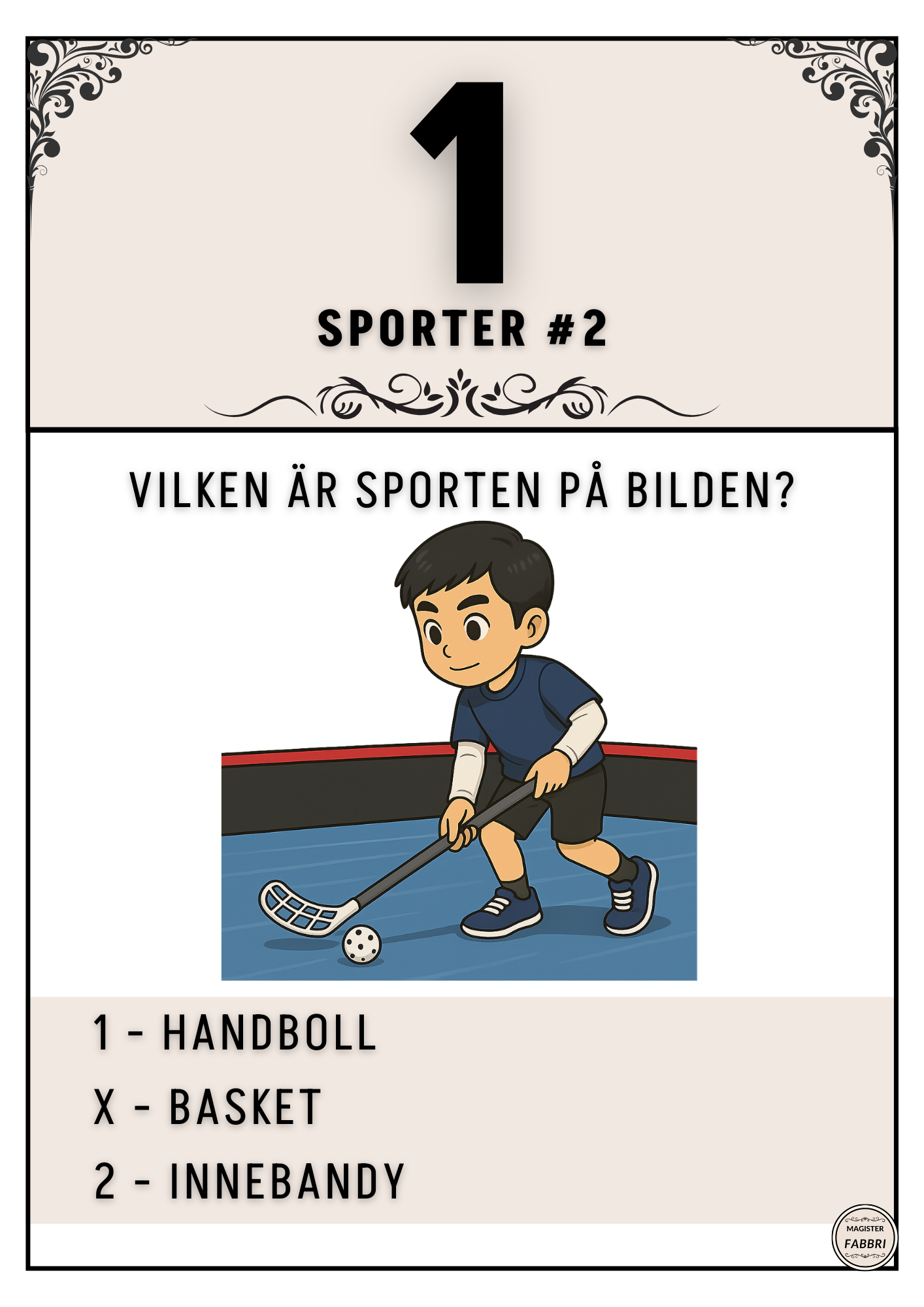 De första två tipspromenaderna har lite enklare/mer kända sporter för mindre barn, svårighetsgraden går upp lite på #3 och #4. Här är frågorna alla identiska där en sport efterfrågas som man kan se på bilden. Den femte och sista fokuserar på olika spelplaner/platser. exempelvis en bild på en basketplan där frågan är vilken sport som utförs där.