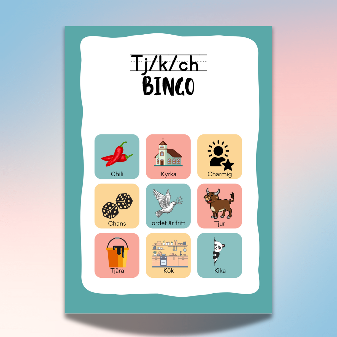 Tj-ljuds bingo är ett pedagogiskt spel som kan användas både analogt och interaktivt med digitala resurser. Spelet syftar till att stärka språkinlärning och främja läsning av sammansatta grafem, särskilt de som involverar ”tj”-ljudet. Spelet kan användas vid uppstart av lektioner för att skapa en positiv och motiverande inlärningsatmosfär, och ger eleverna möjlighet att öva både i grupp och individuellt.