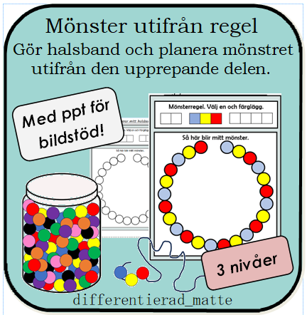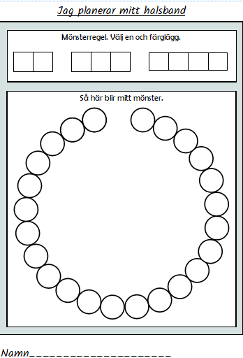 Låt eleverna trä halsband med pärlor när de tränar på mönster. Här får du ett arbetsblad där de planerar sitt halsband genom att först skapa mönstrets regel, dvs den upprepande delen. Sedan ritar de hela mönstret genom att upprepa regeln. Efter det skapar de halsbandet.