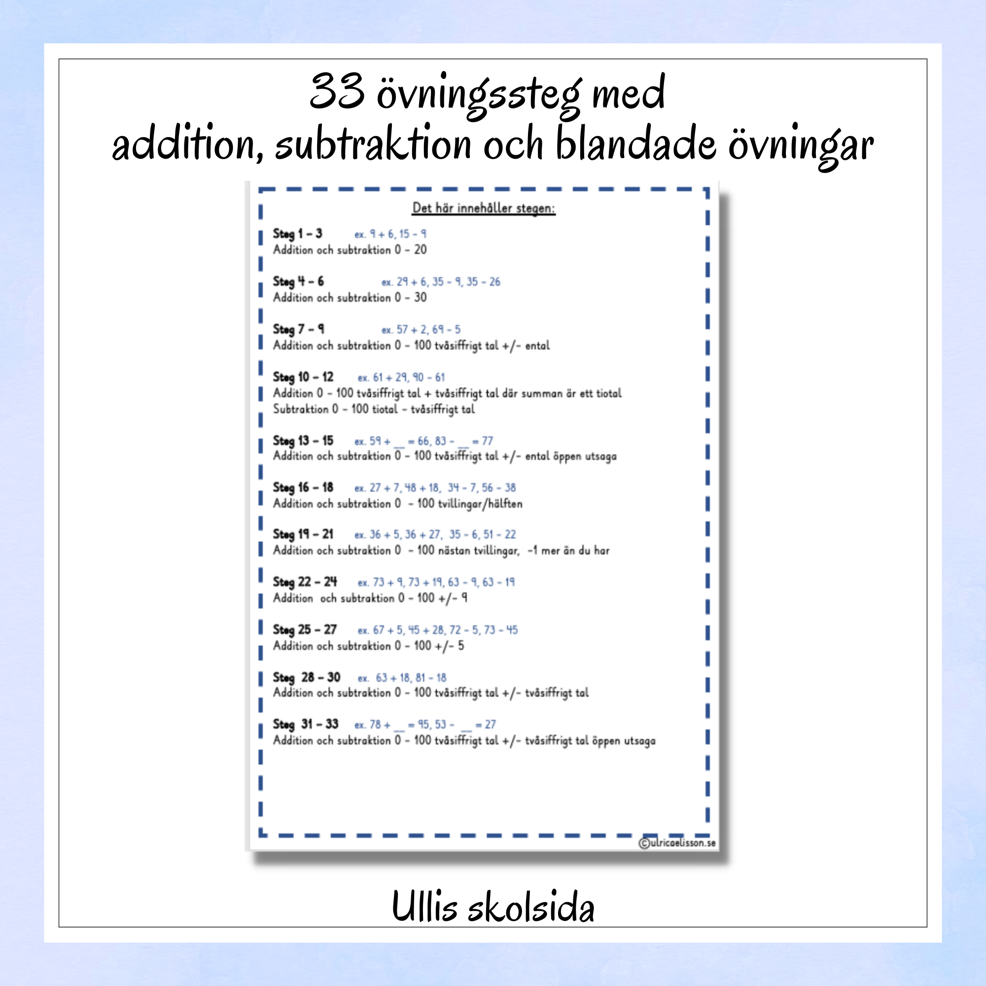 Materialet innehåller 33 övningssteg och till varje övningssteg finns en tabelltest. Dessa steg är grupperade 3 och 3. Först är det ett steg med bara addition, sedan ett med bara subtraktion och det tredje steget är ett blandat med både addition och subtraktion från de två tidigare stegen.