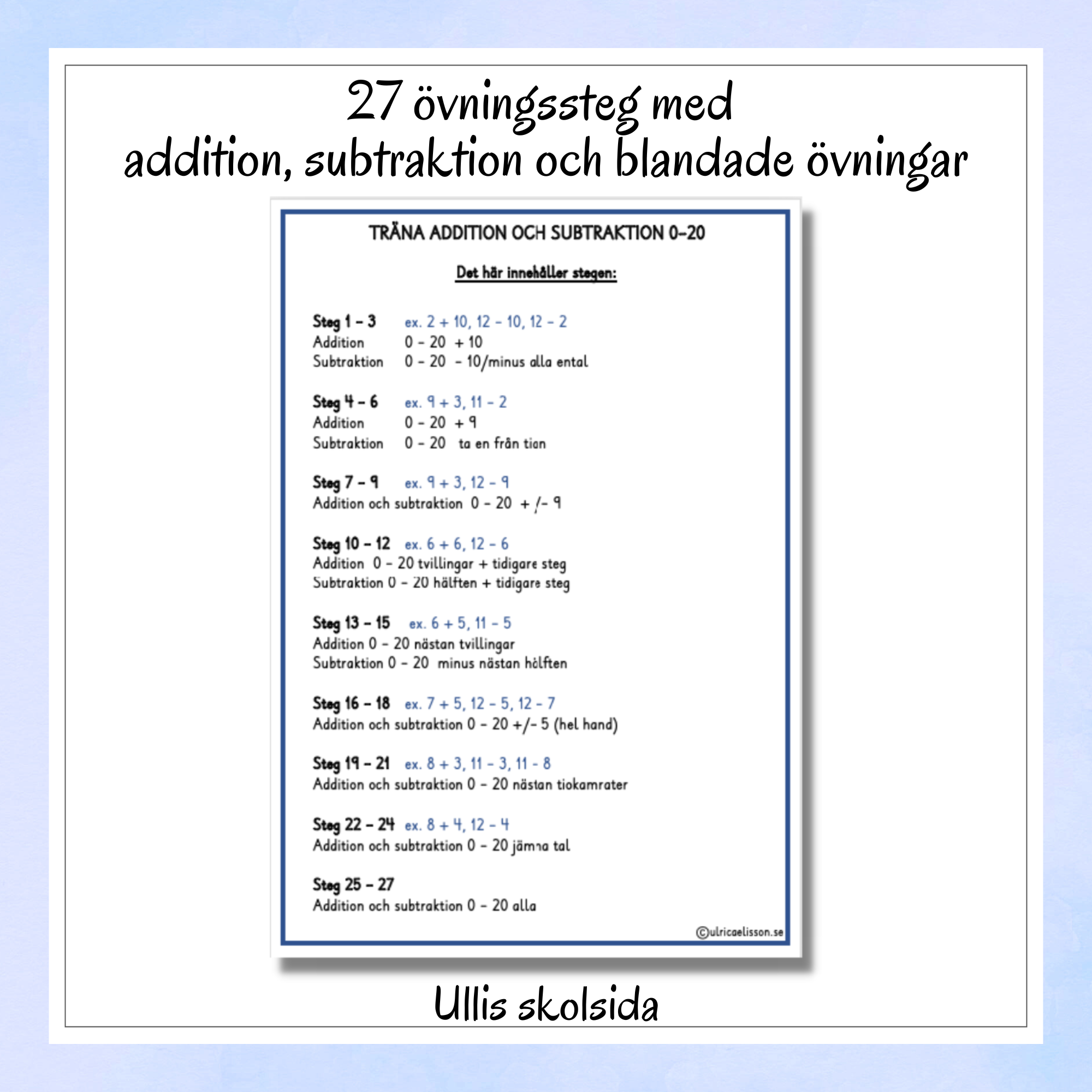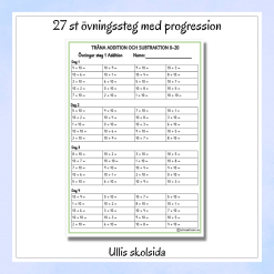 Materialet innehåller 27 övningssteg och till varje övningssteg finns en tabelltest. Dessa steg är grupperade 3 och 3. Först är det ett steg med bara addition, sedan ett med bara subtraktion och det tredje steget är ett blandat med både addition och subtraktion från de två tidigare stegen.