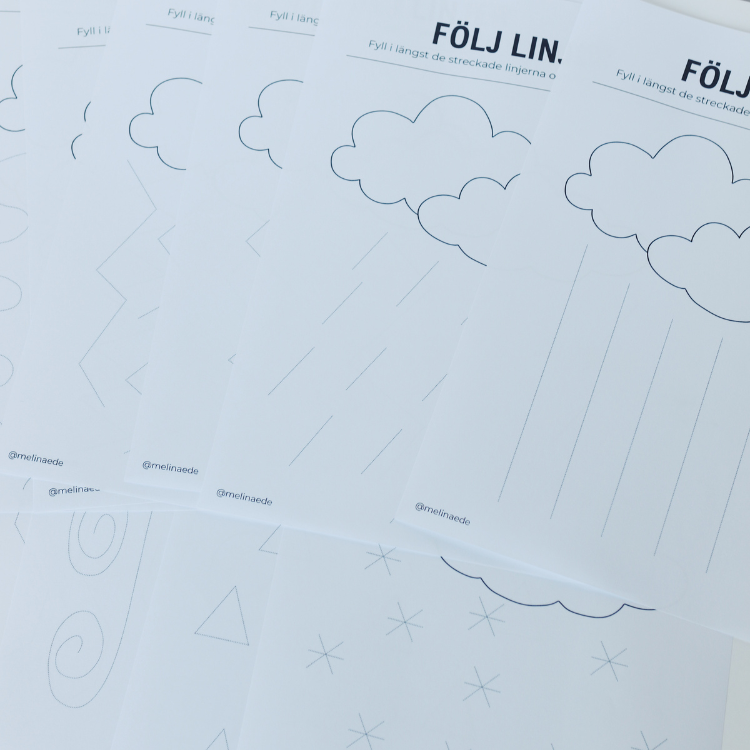 Träna med penna. Följ de streckade linjerna för att rita väder under molnen. Innehåller 13 sidor i olika svårighetsgrad.
