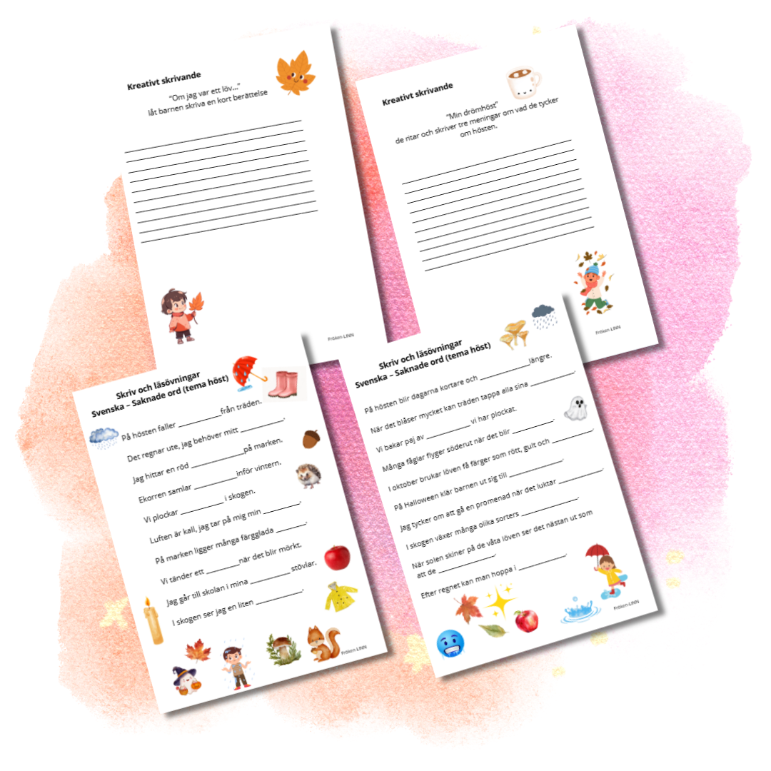 Eleverna får öva på att skriva egna meningar och använda fantasin. De skriver korta berättelser utifrån givna teman som hösten eller naturen.