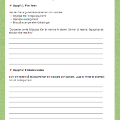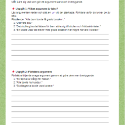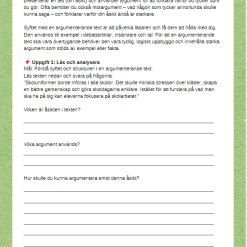 Eleverna får läsa och analysera en kort text, identifiera tes, argument och motargument samt träna på att formulera egna argument.