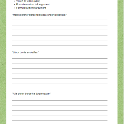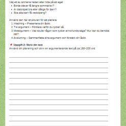 Eleverna får planera och skriva en egen argumenterande text utifrån en given struktur med inledning, argument, motargument och avslutning.