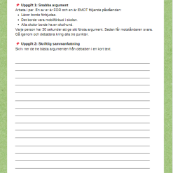 En muntlig övning där eleverna får öva på att argumentera i en snabb debatt och sedan sammanfatta sina bästa argument i skrift.