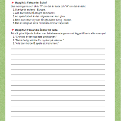 Eleverna får lära sig skillnaden mellan fakta och åsikt samt träna på att stärka sina åsikter genom att lägga till fakta och exempel.