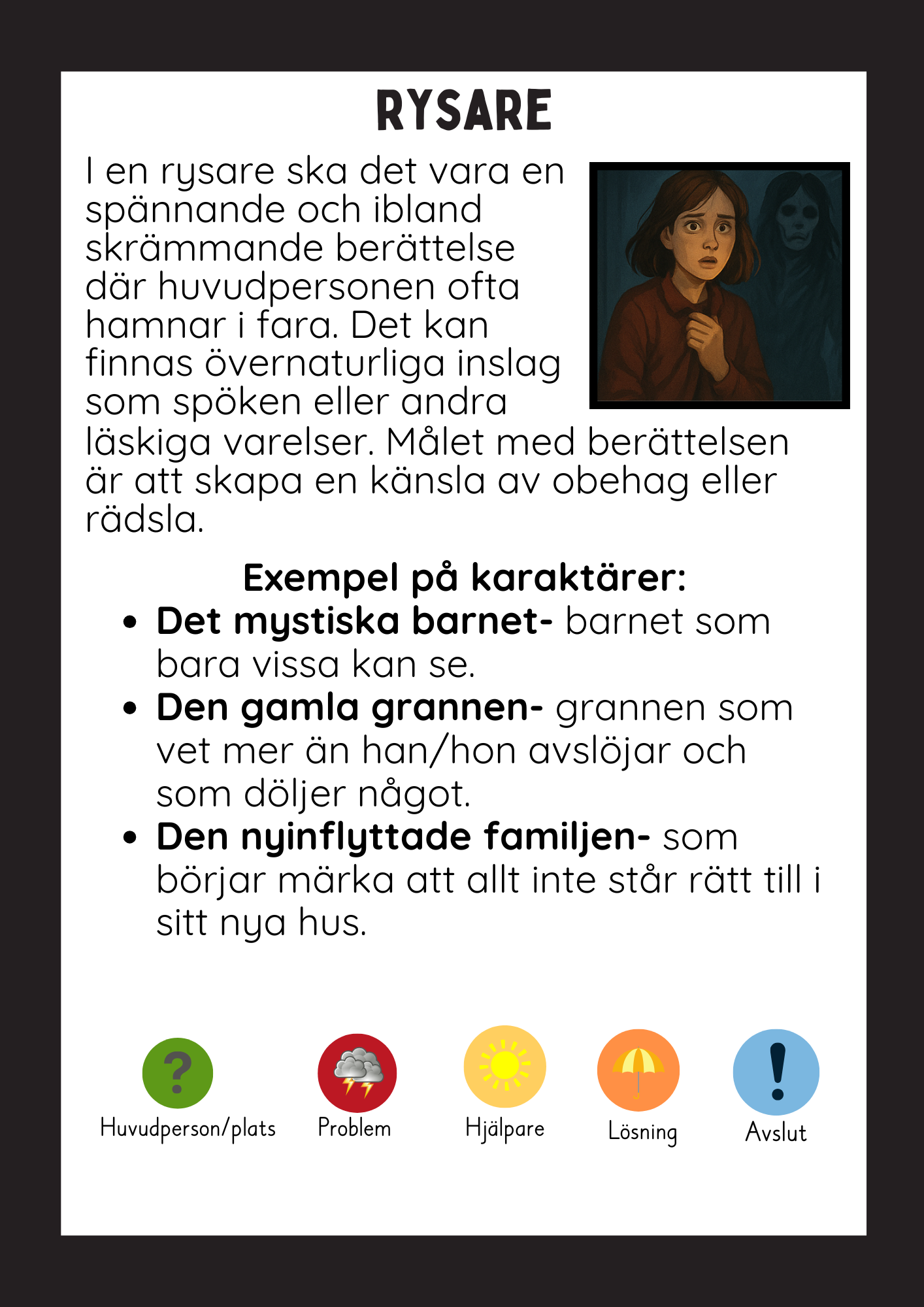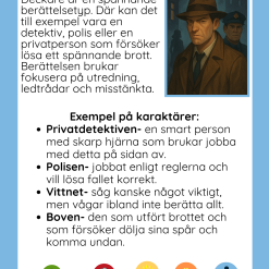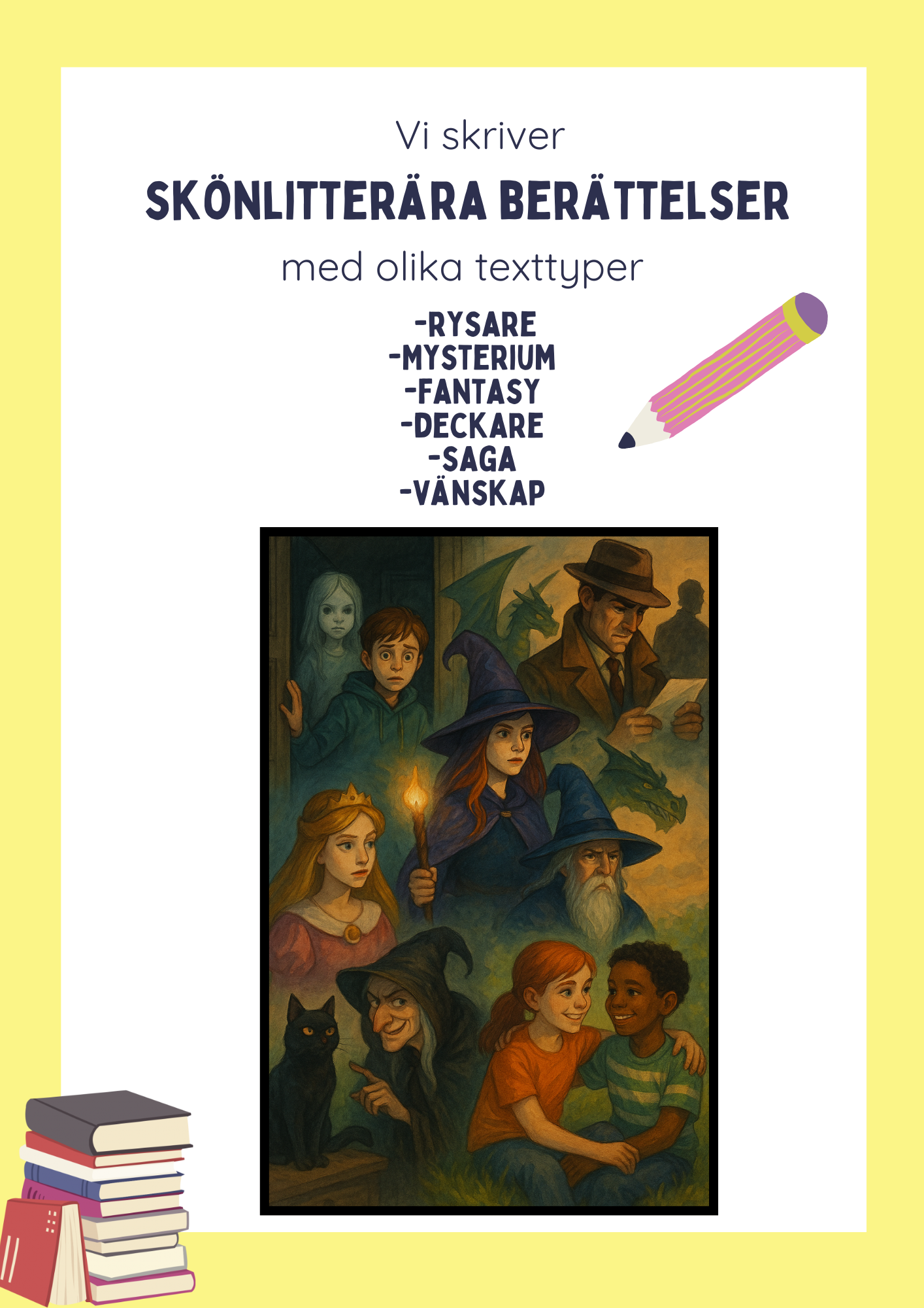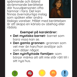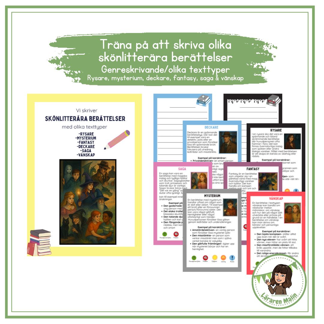 Ett material för att skriva berättande texter med olika texttyper – rysare, mysterium, deckare, saga, vänskap samt fantasy. Till varje genre är det kort info samt förslag på karaktärer. Sedan följer två sidor där eleverna ska skriva sin egen berättelse. Tips är att kolla på serien ”Skriv” som finns på UR innan eleverna arbetar med varje genre. De tar upp alla dessa.