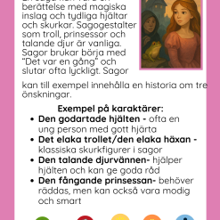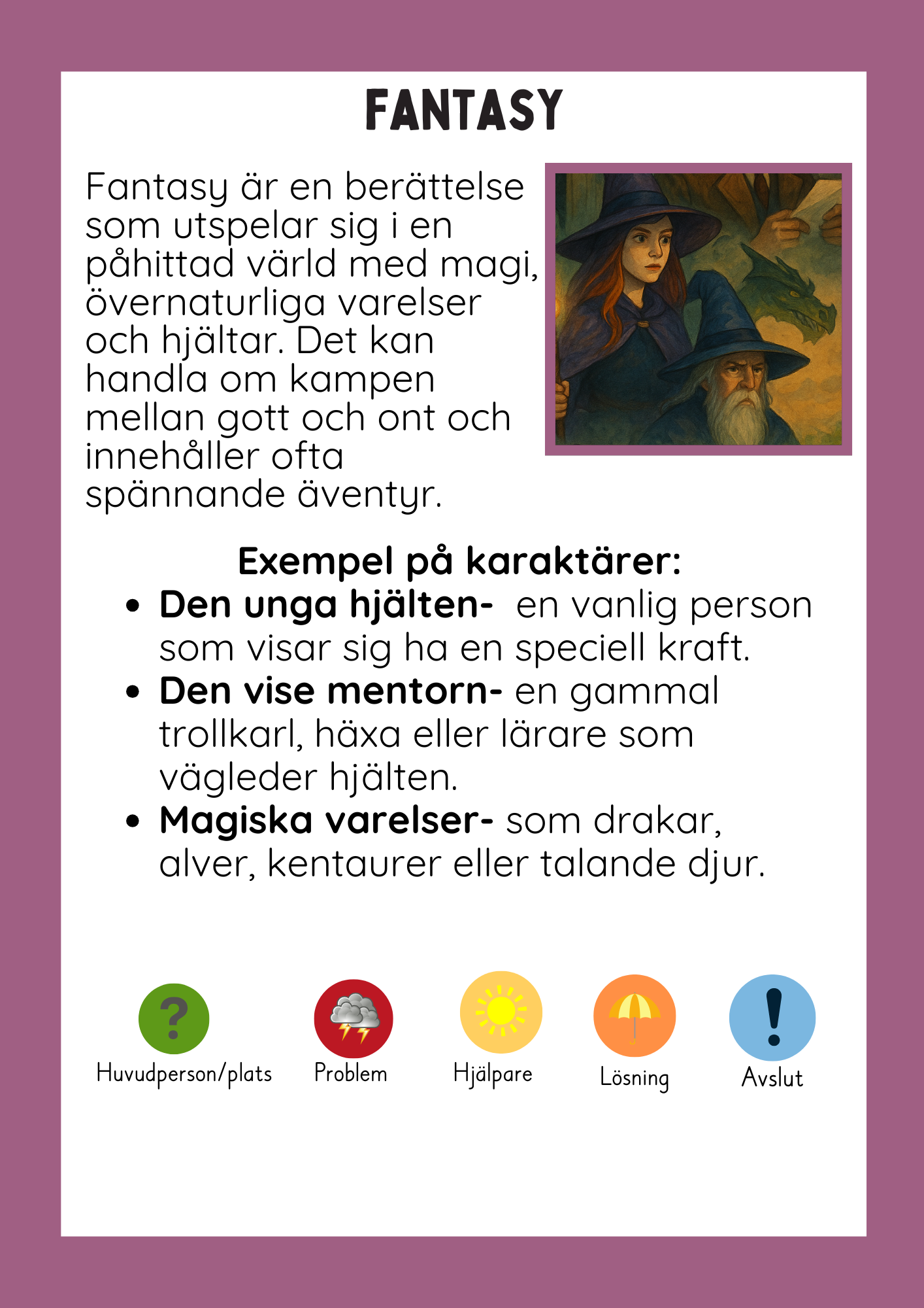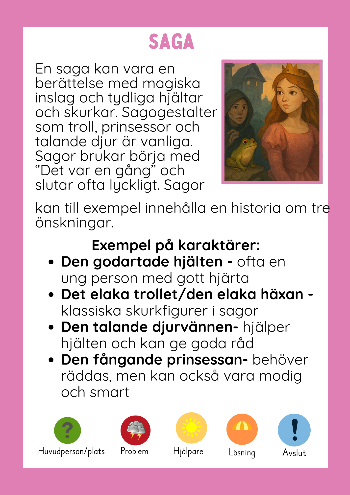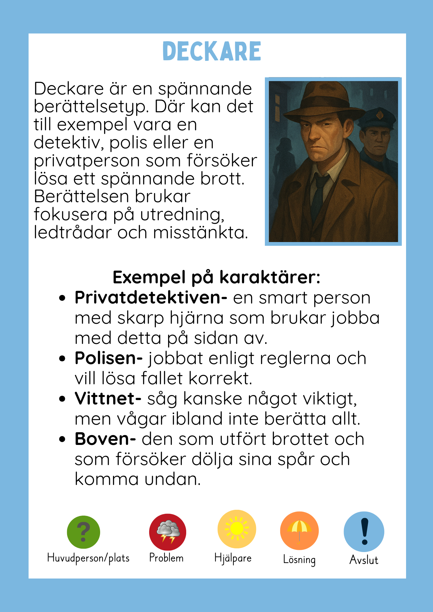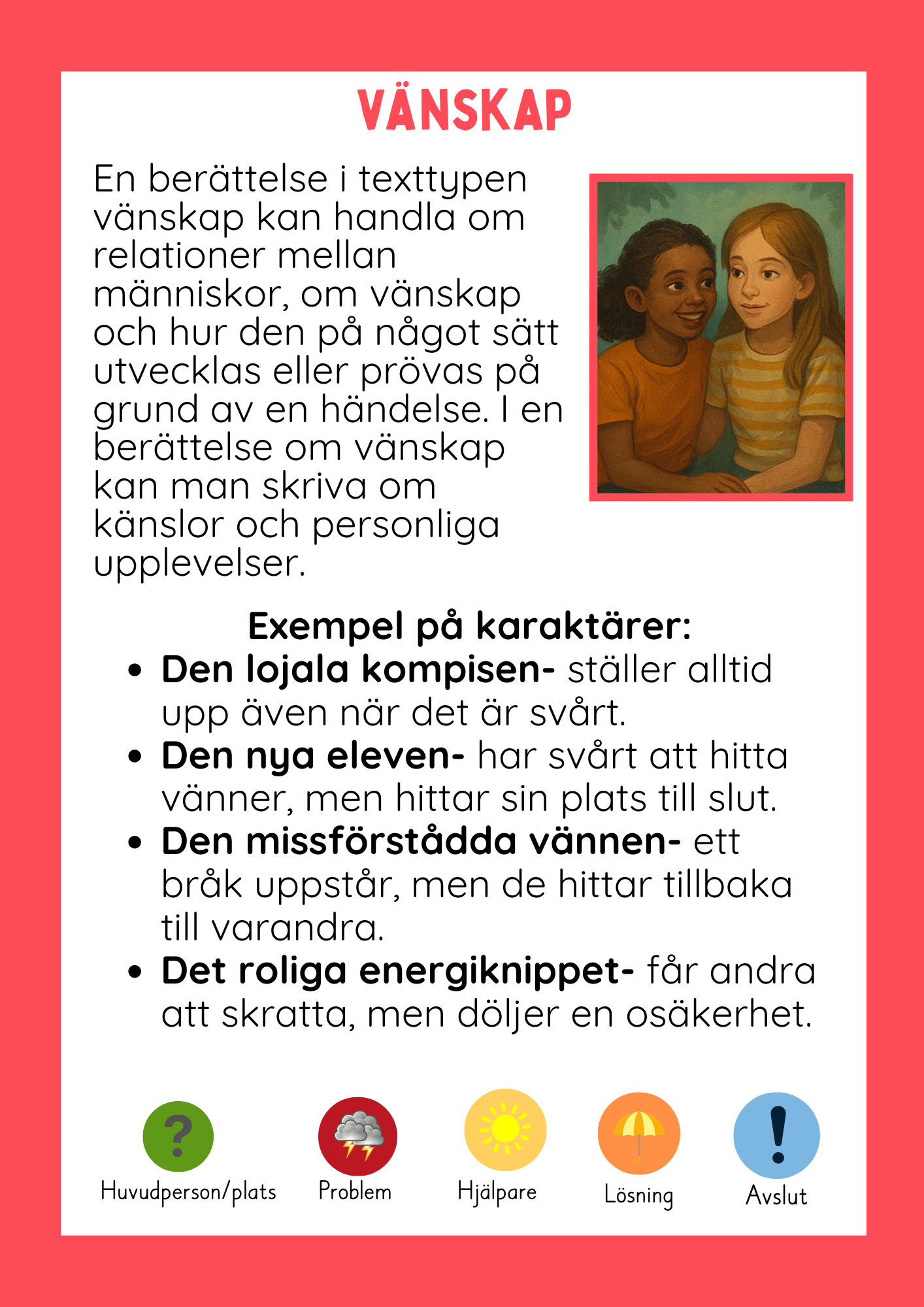 Ett material för att skriva berättande texter med olika texttyper – rysare, mysterium, deckare, saga, vänskap samt fantasy. Till varje genre är det kort info samt förslag på karaktärer. Sedan följer två sidor där eleverna ska skriva sin egen berättelse. Tips är att kolla på serien ”Skriv” som finns på UR innan eleverna arbetar med varje genre. De tar upp alla dessa.