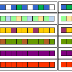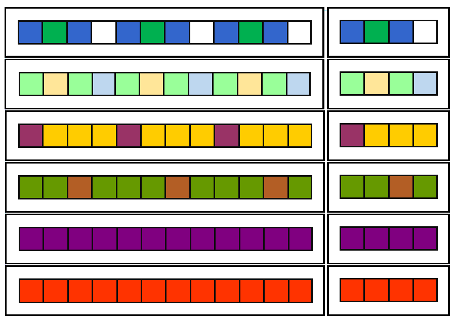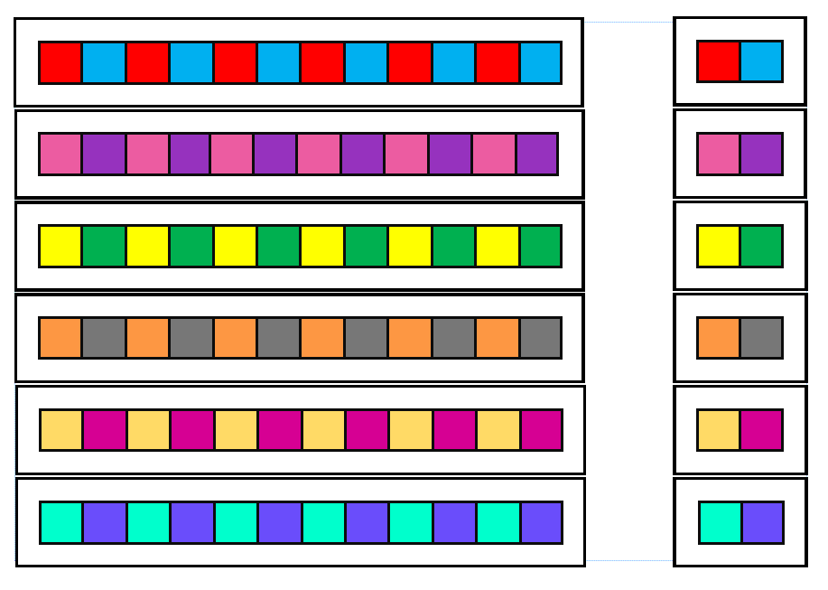 Materialet finns i 5 nivåer. Varje nivå har en färg. I varje nivå finns det 6 olika mönster.