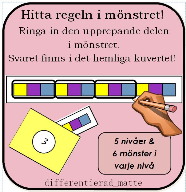 Träna på att se och markera den upprepande delen i ett mönster, dvs mönstrets regel. Detta är ett material som passar utmärkt vid stationsarbete eller vid en aktivitet på en lektion. Använd materialet när ni tränar på den upprepande delen, när eleverna ska befästa eller repetera.