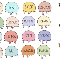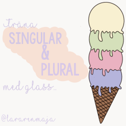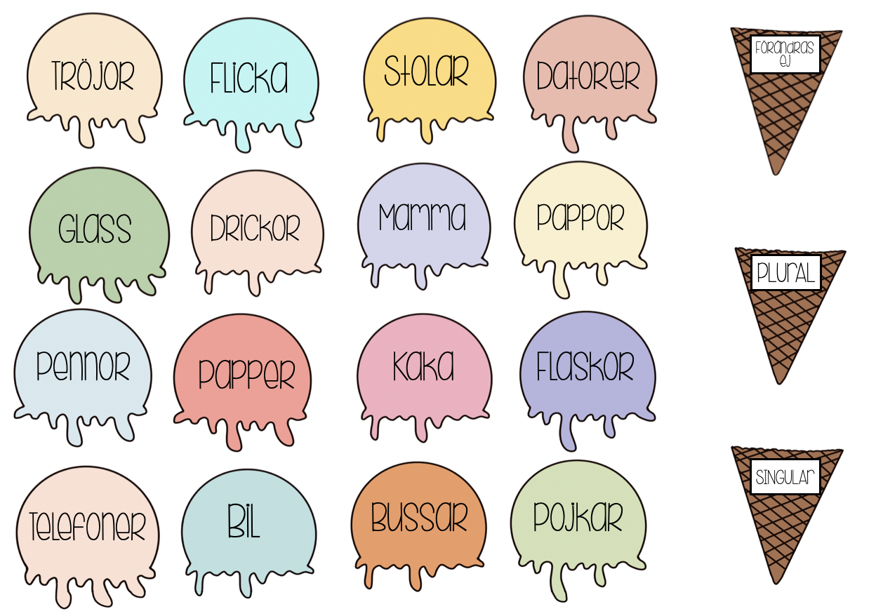 TrÀna singular och plural med glass. Klipp ut glasskulorna och strutarna och lÄt eleverna placera rÀtt ord pÄ rÀtt strut.