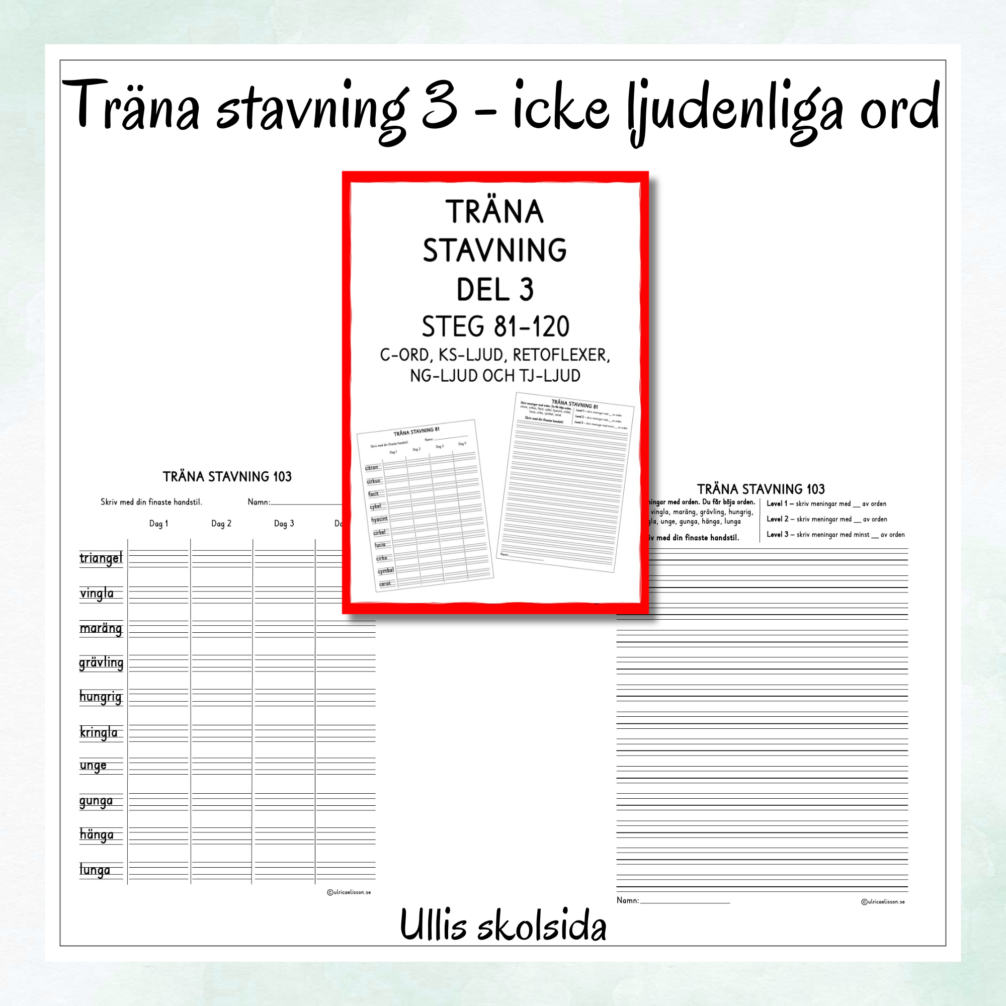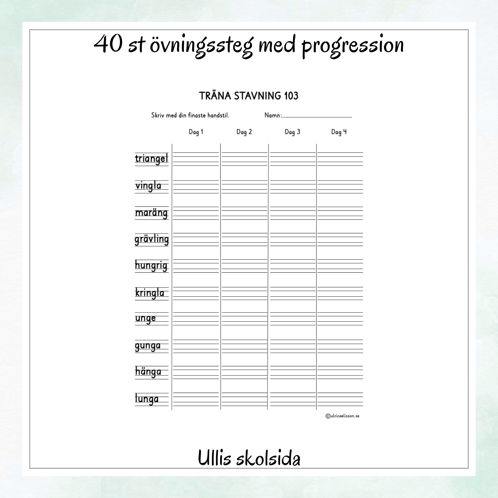Materialet innehåller 40 övningssteg och till varje övningssteg finns ett papper för att skriva meningar med veckans ord. Detta är tänkt att användas på fredagar. Det finns även med ett skrivpapper om man istället vill göra en diktamen. Dessa steg är grupperade efter en stigande progression.