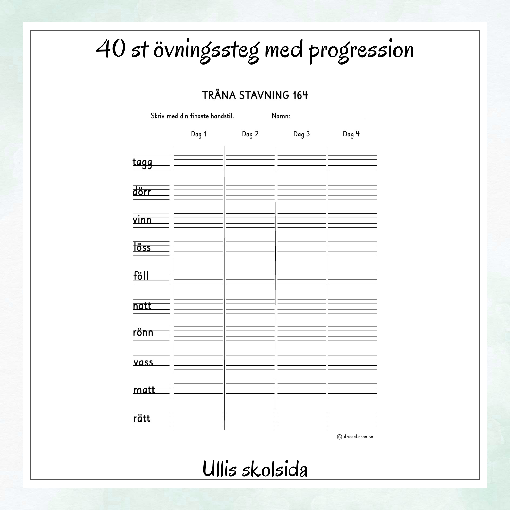Materialet innehåller 40 övningssteg och till varje övningssteg finns ett papper för att skriva meningar med veckans ord. Detta är tänkt att användas på fredagar. Det finns även med ett skrivpapper om man istället vill göra en diktamen. Dessa steg är grupperade efter en stigande progression. Du hittar progressionen på kommande sidor. Det finns även med en tom sida som du kan skriva ut för att skriva dit egna ord på. Sist i materialet finns det olika planscher med reglerna som du kan skriva ut och sätta upp i klassrummet.
