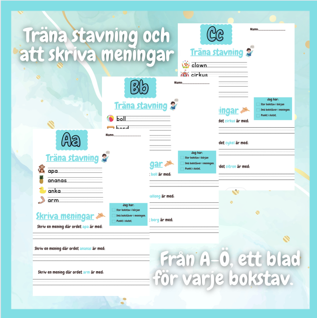 Träna stavning och skriva meningar (29 arbetsblad, från A-Ö)