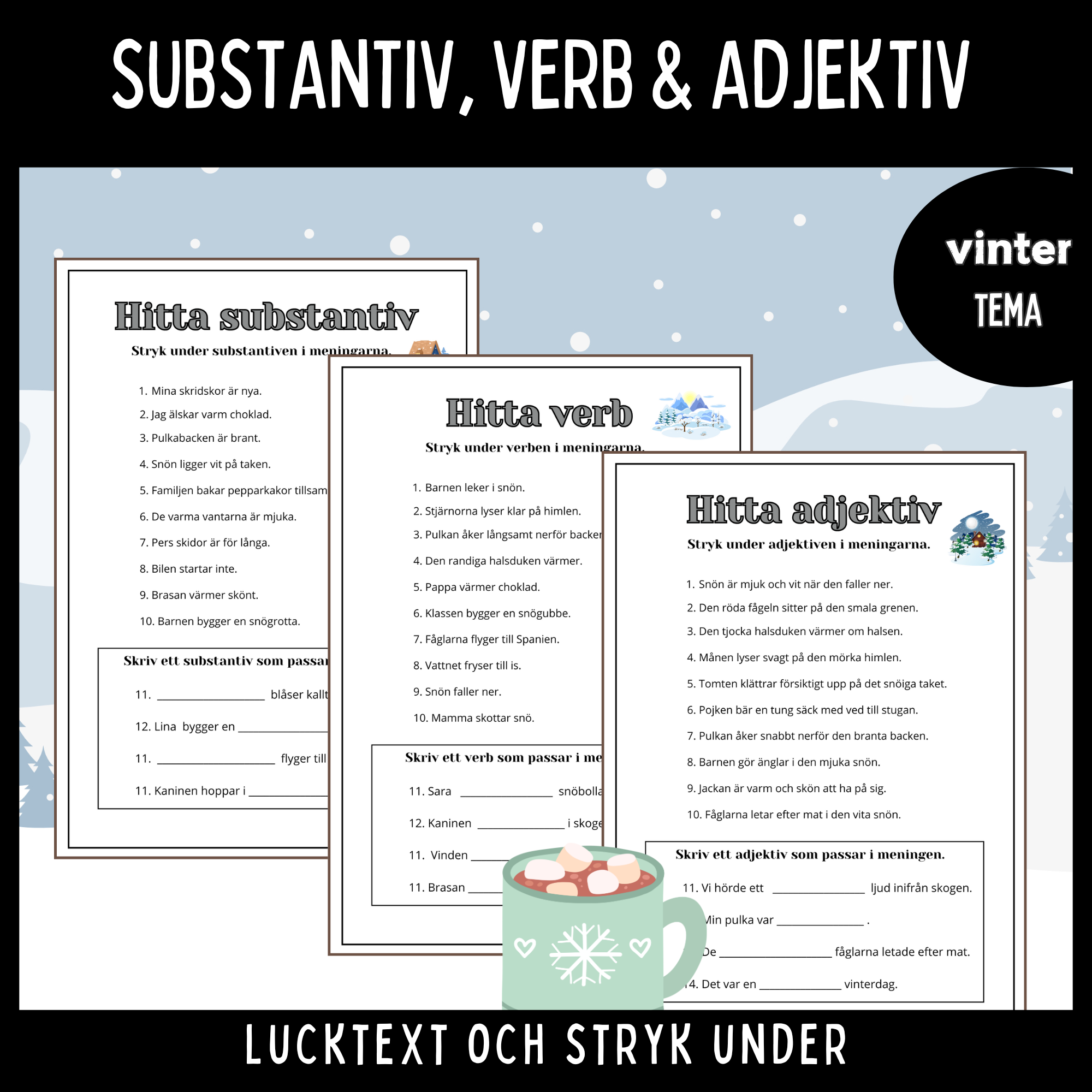 Innehåller 3 arbetsblad, ett för varje ordklass.