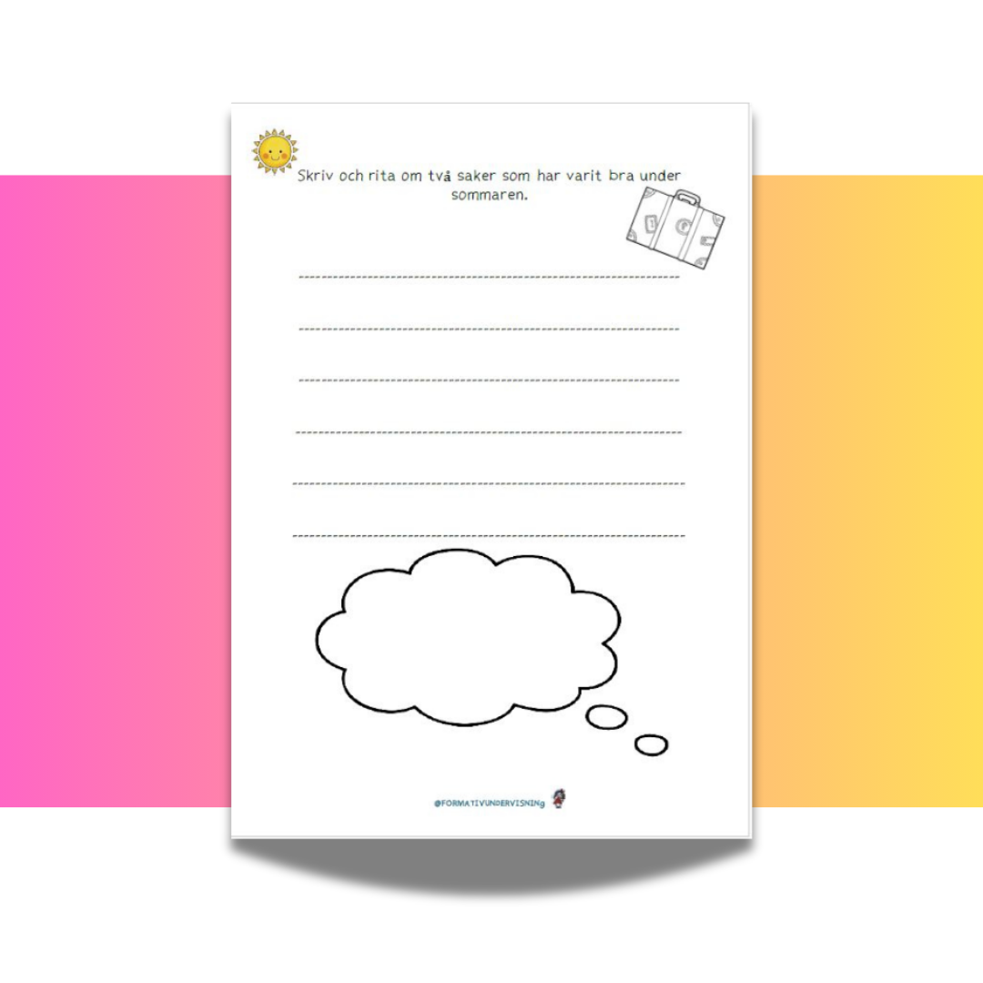 Uppstartsuppgifter med lite smått och gott; ordsök, färgläggning, skriva en kort berättelse om sommaren, geometri, grammatik. Lite hjärngympa för de första veckorna i augusti. Sammanlagt 7 arbetsblad plus ett facit i slutet av arbetshäftet.