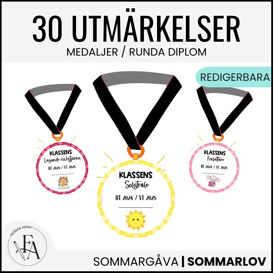 I paketet ingår 30 färdiga utmärkelser att skriva ut och laminera, samt tomma cirklar där ni själva kan skriva in valfri rubrik och lägga in bild.