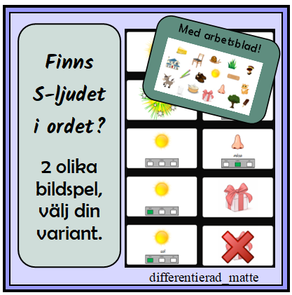 Till bildspelet finns även ett arbetsblad med alla bilder. Eleverna ringar in de bilder som har ljudet S i sig, samt att de kryssar över bilder som inte har det. Arbetsbladet är första sidan i ett bildspel. Bildspelet används sedan för genomgång av de rätta svaren. Detta arbetsblad kan användas i samband med det första bildspelet eller några dagar senare som repetition.